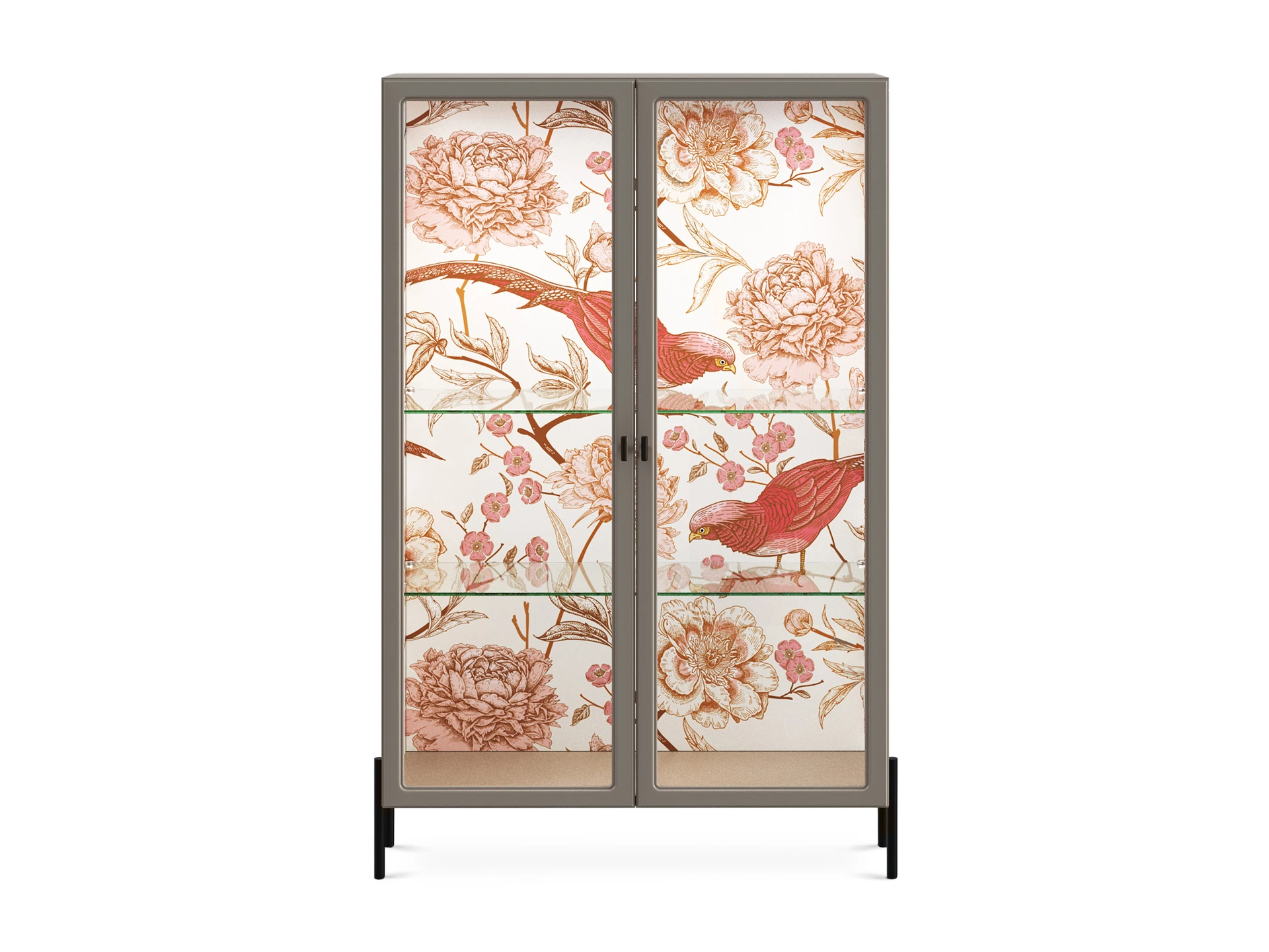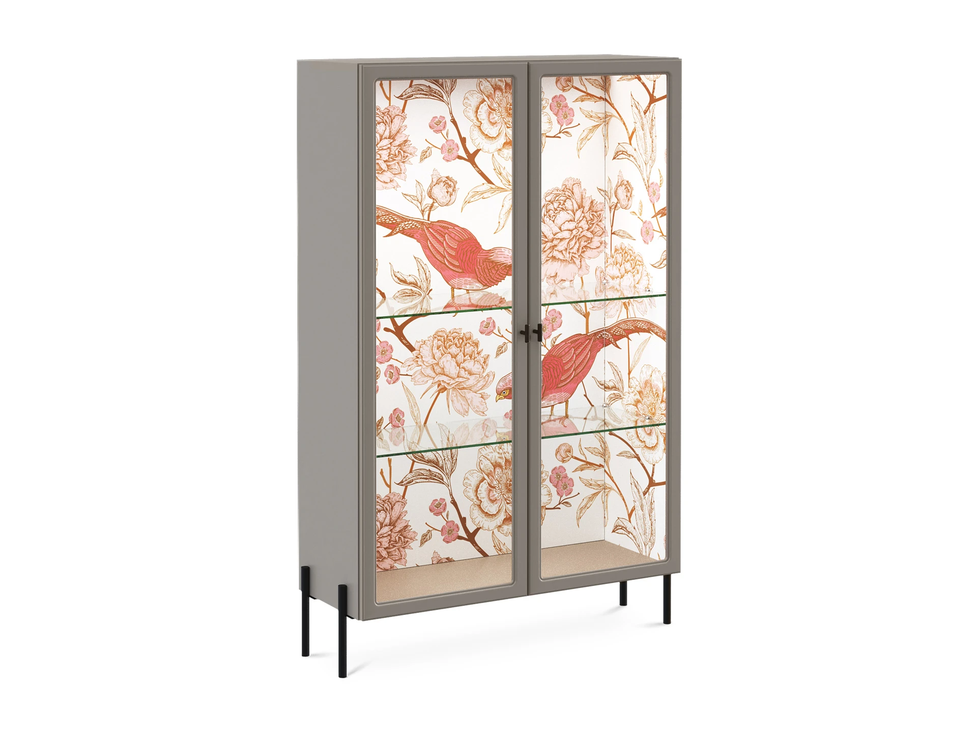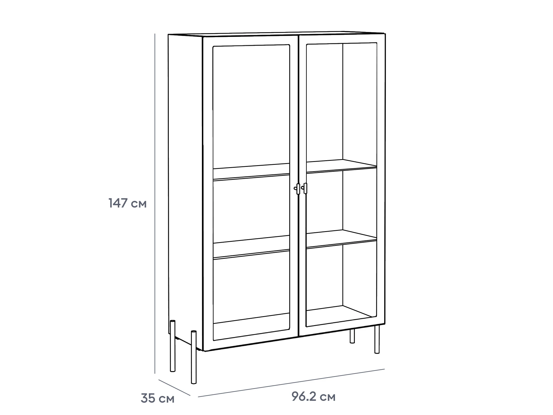 Витрина с двумя распашными фасадами. Рамка фасадов прямая. Количество полок – 2 шт.
