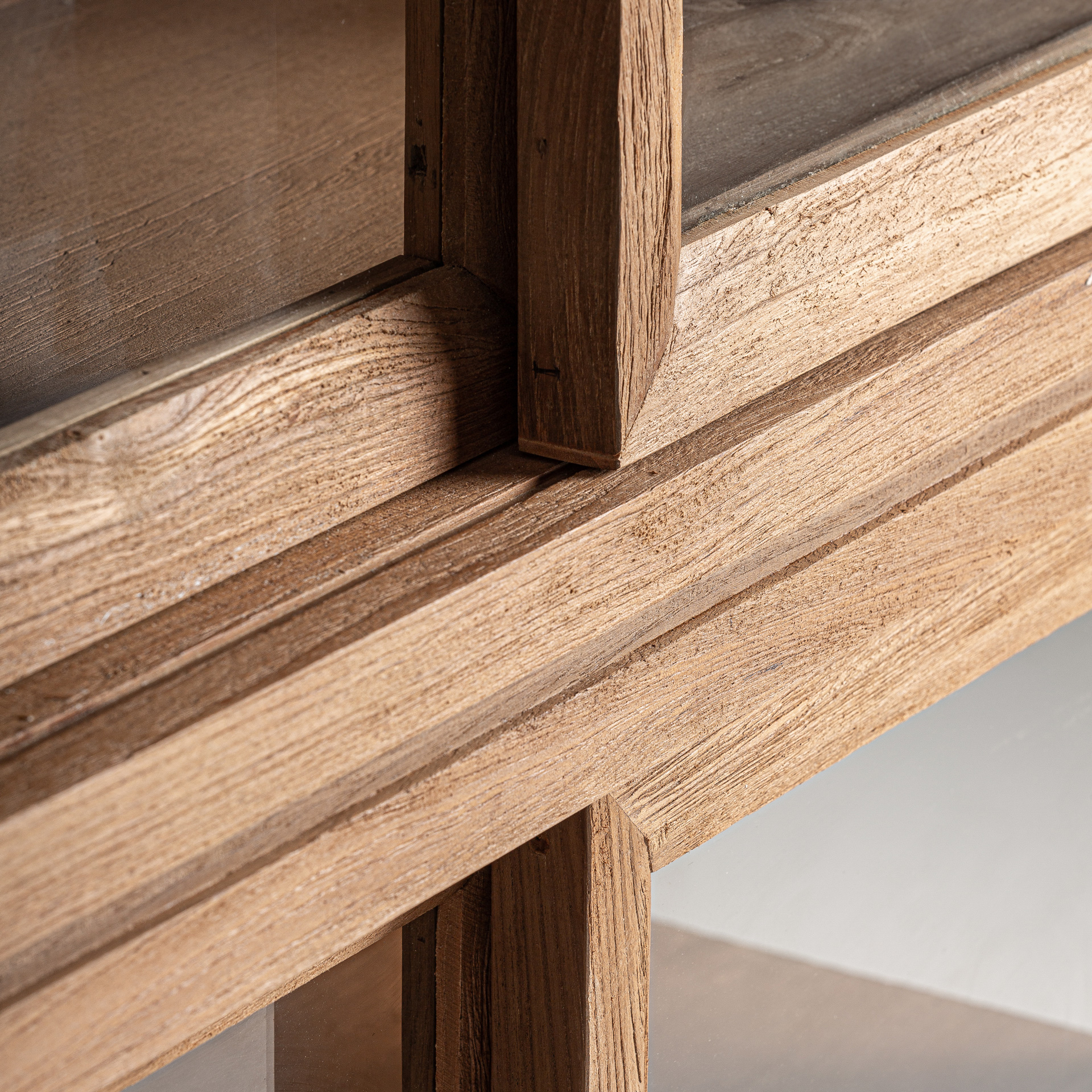 Витрина, изготовленная из тикового дерева коричневого цвета.