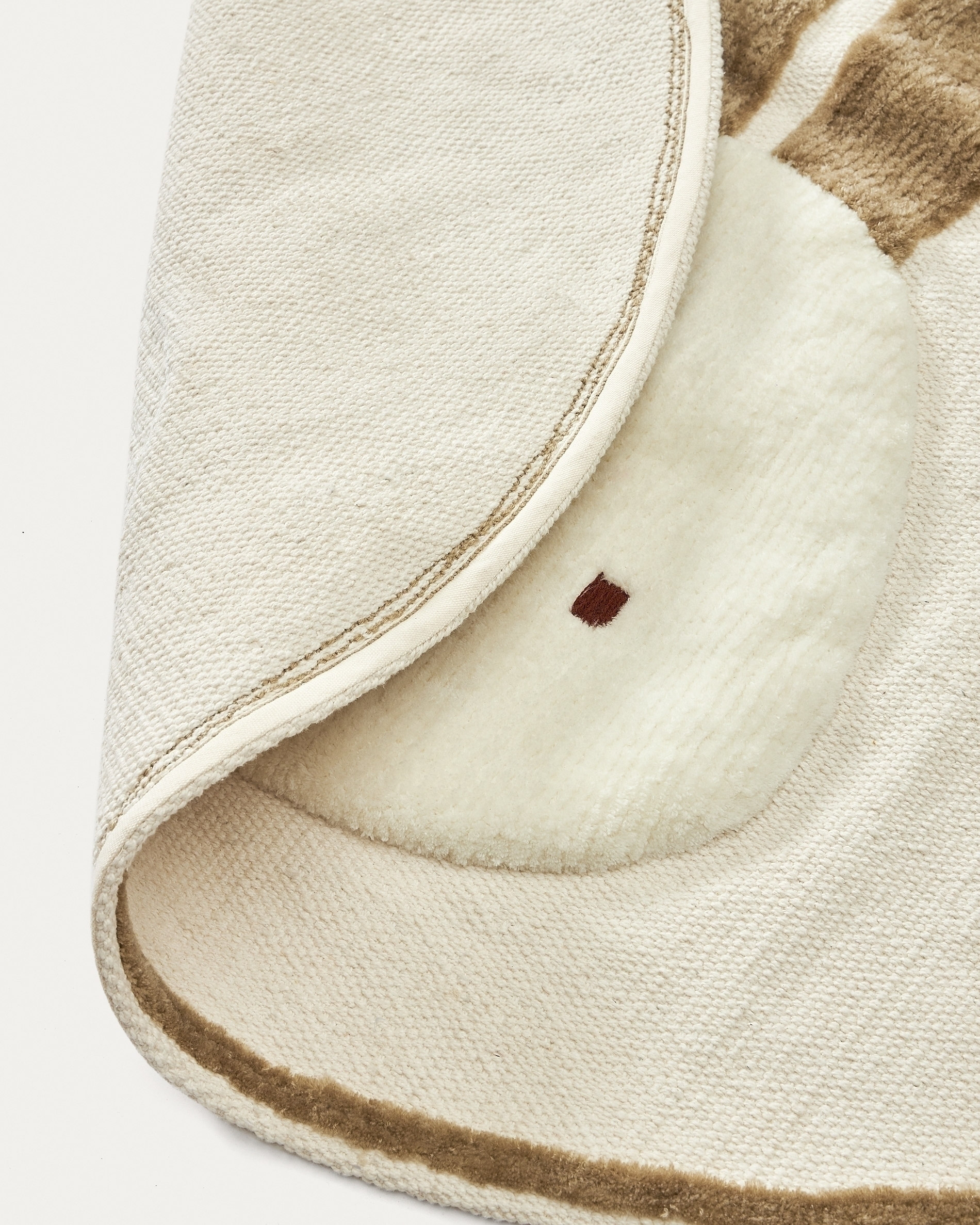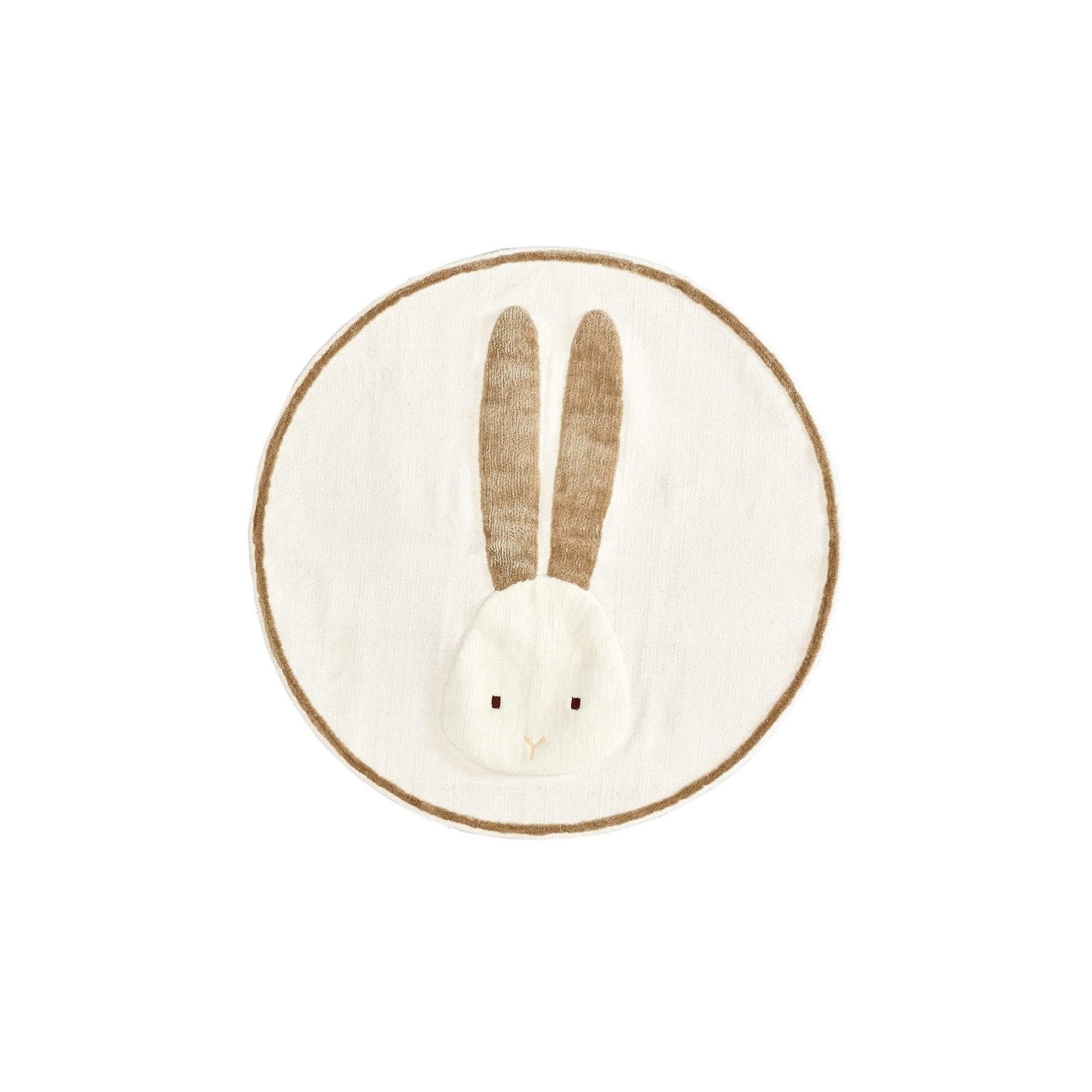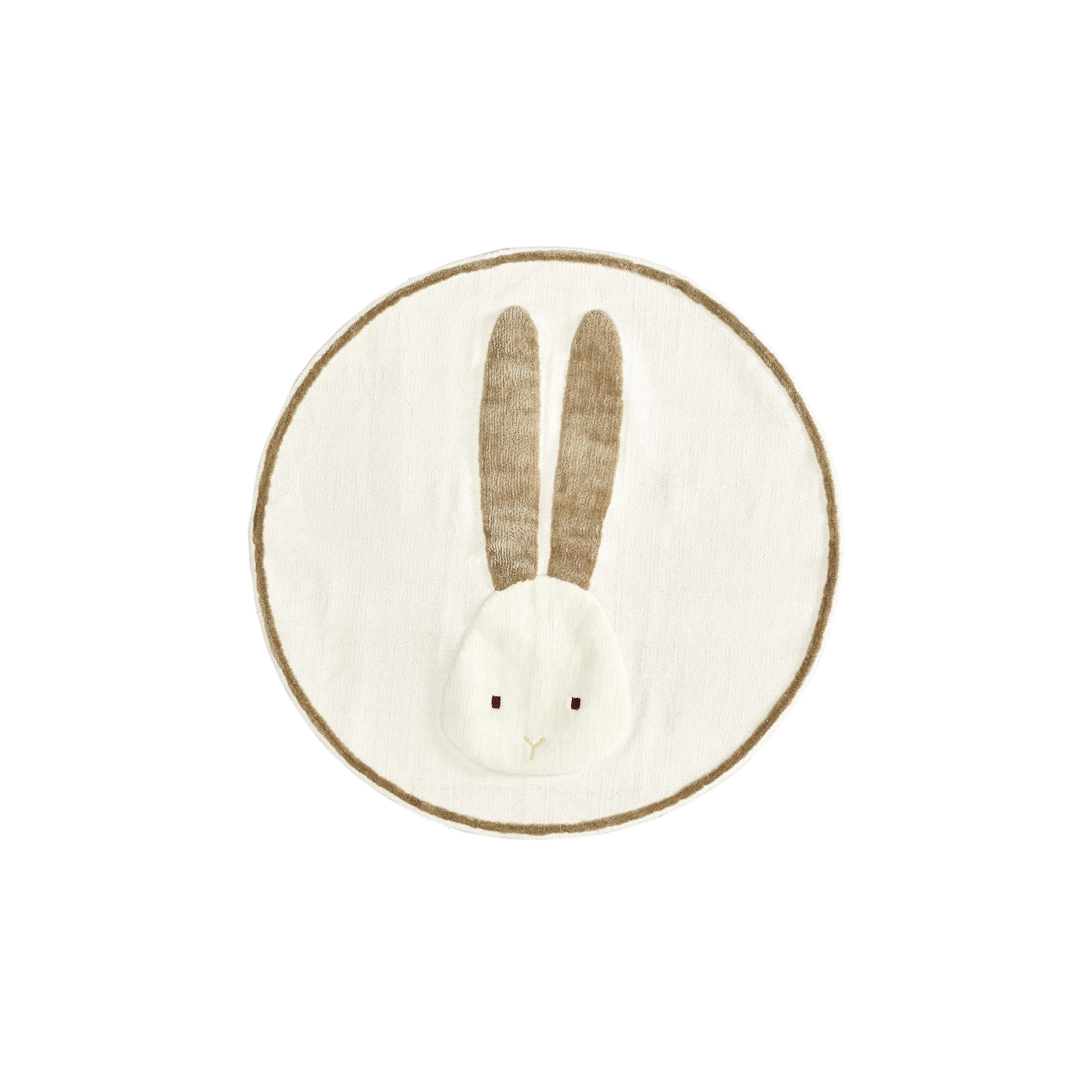 Форма коврика круглая, окантована бежевой шерстяной нитью. В коллекции Yanil два варианта принта — заяц с набивными ушами из шерсти и мелкие разноцветные листья.