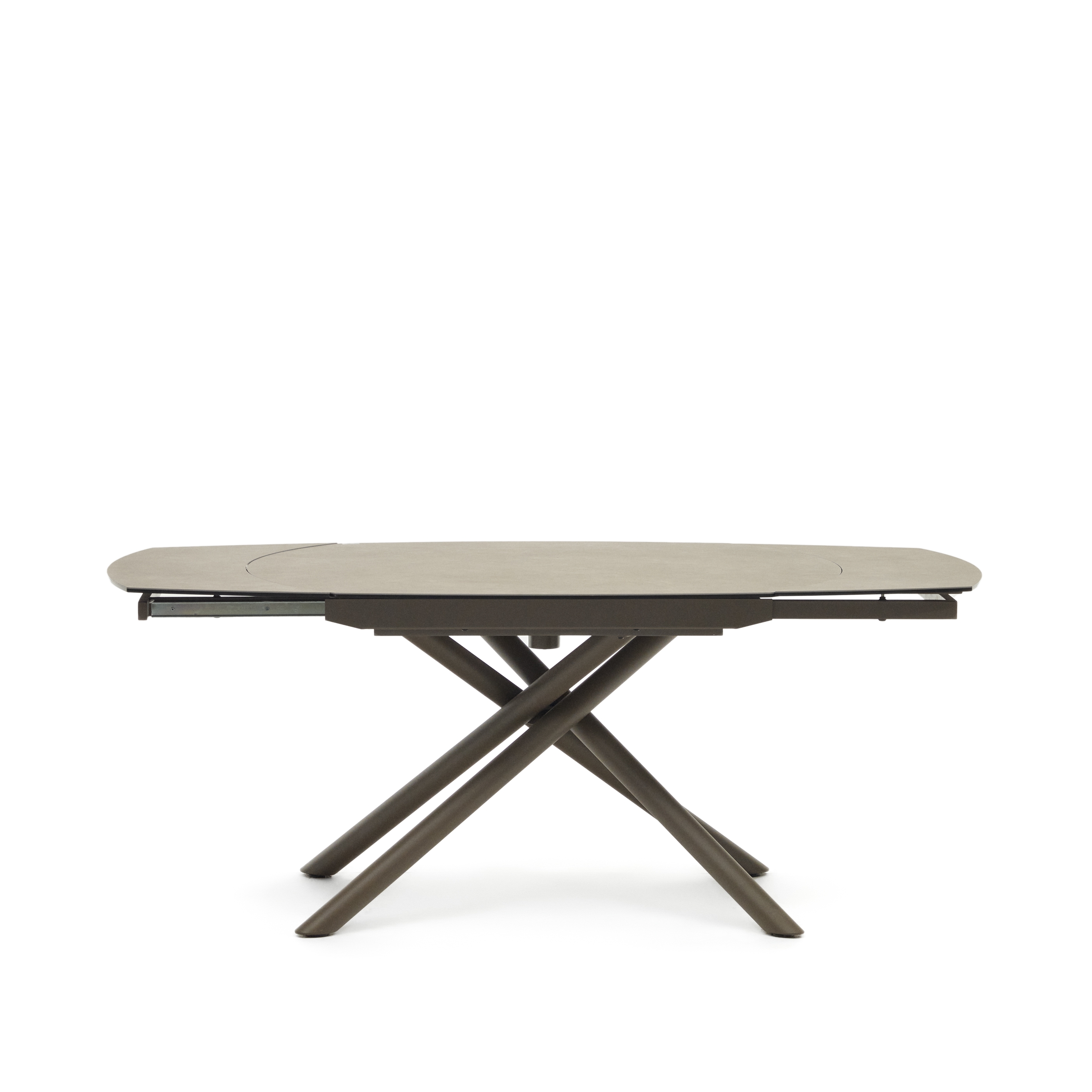 На этом раздвижном столе с фарфоровой столешницей найдется место для всех. Благодаря перекрещивающейся стальной конструкции ножек он обеспечивает больше пространства между стульями, повышает комфорт и облегчает передвижение.