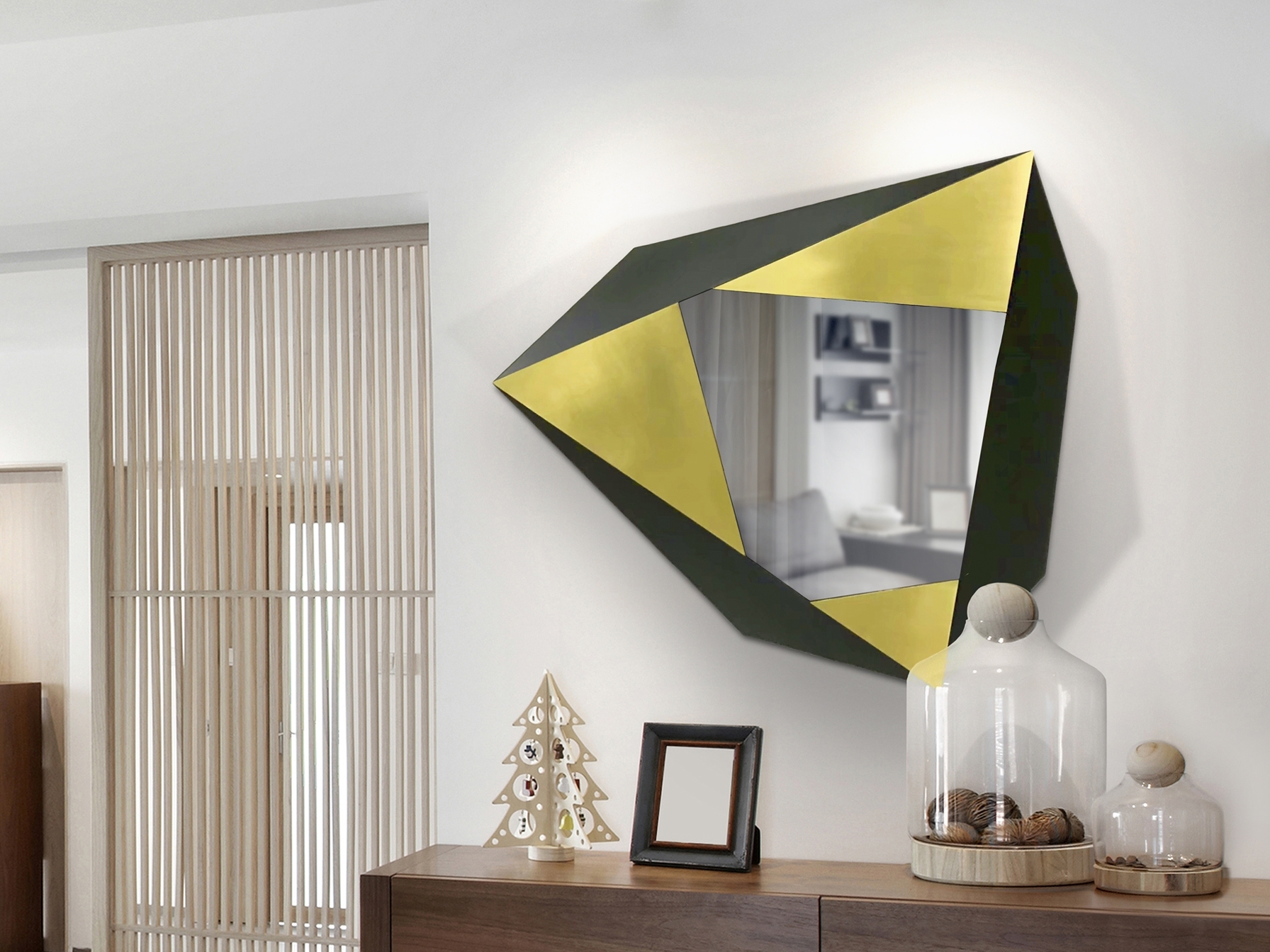 Барельеф, выполненный из листов матовой нержавеющей стали, образующих сферическую сетку неправильных многогранников. Отделка золотом и черным.