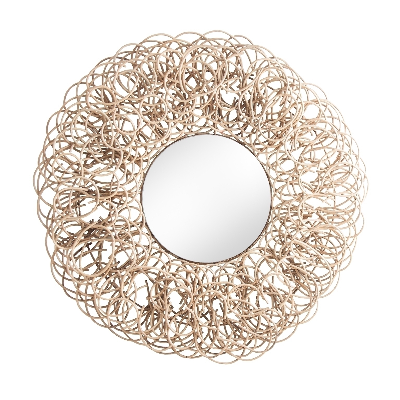 Зеркало круглое, натурального цвета, в современном стиле. Изготовлен из ротанга, в сочетании с зеркалом.