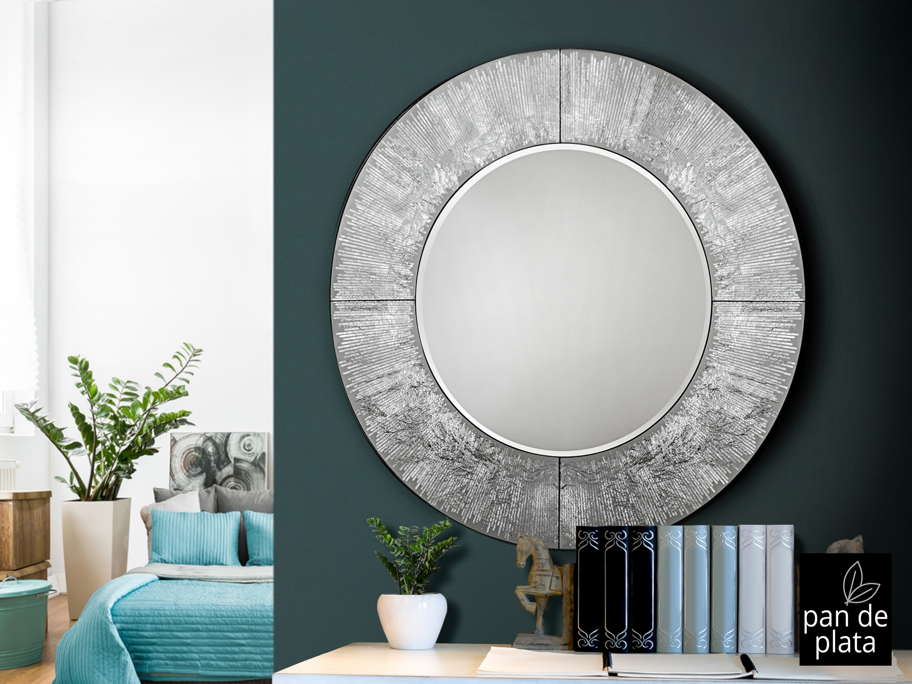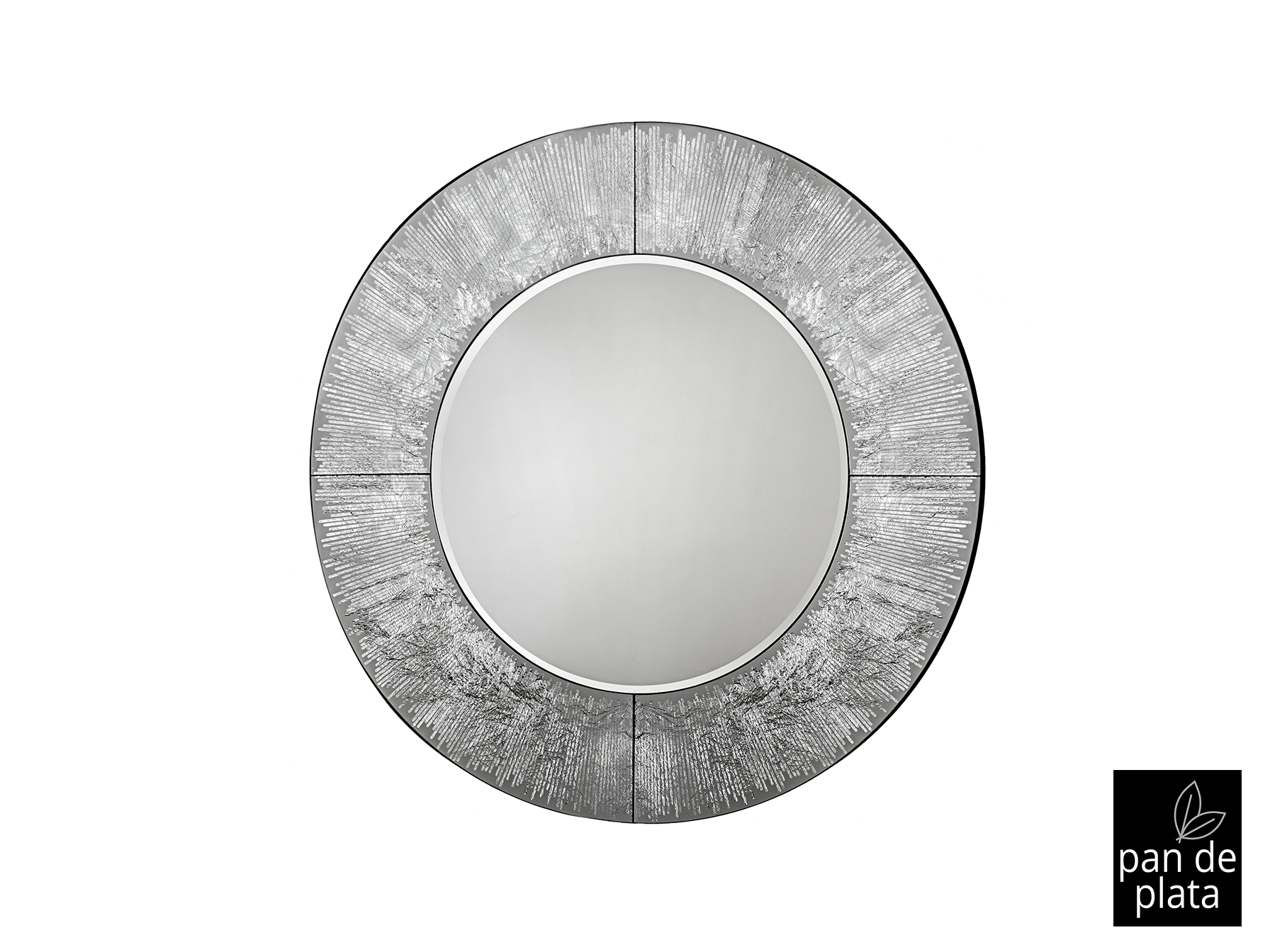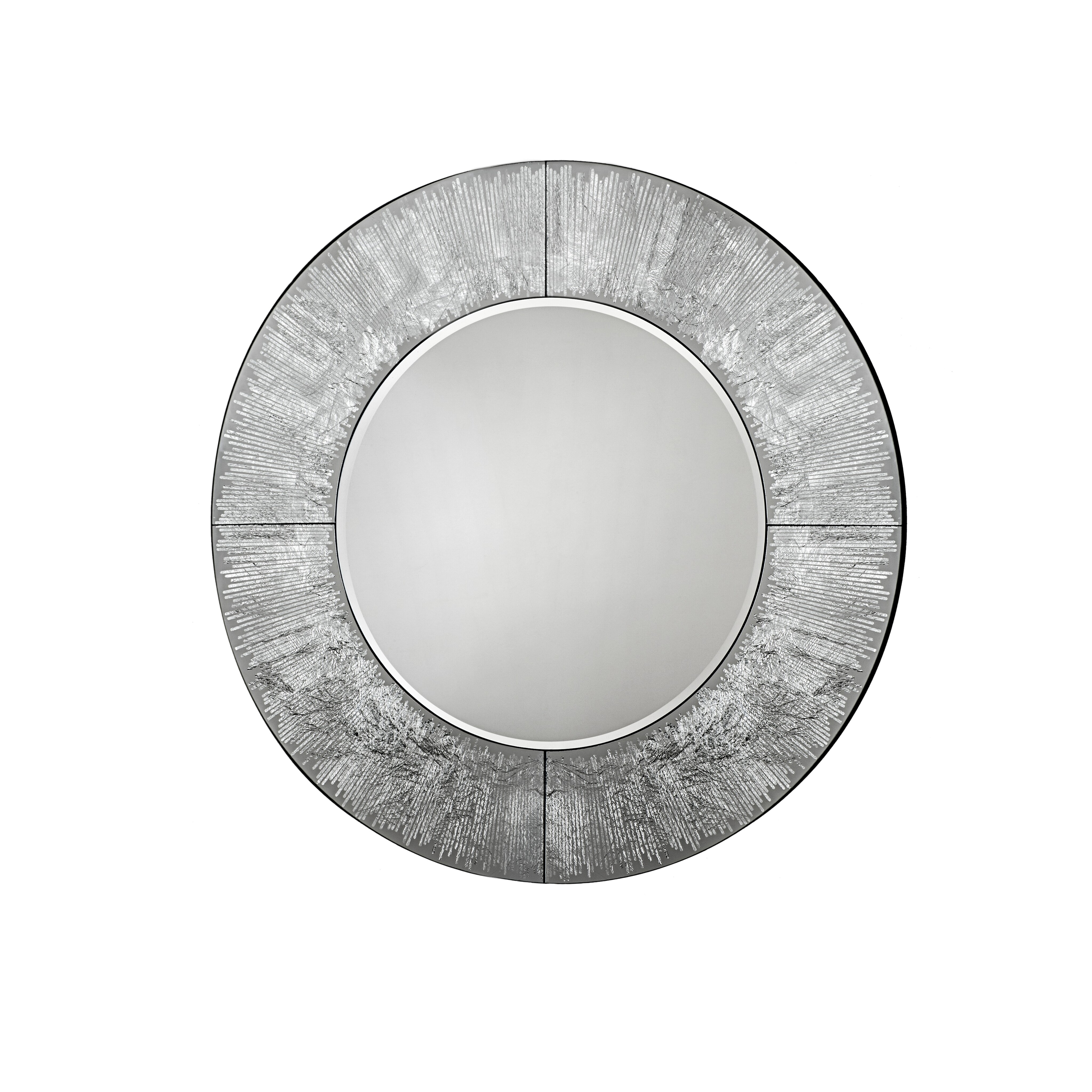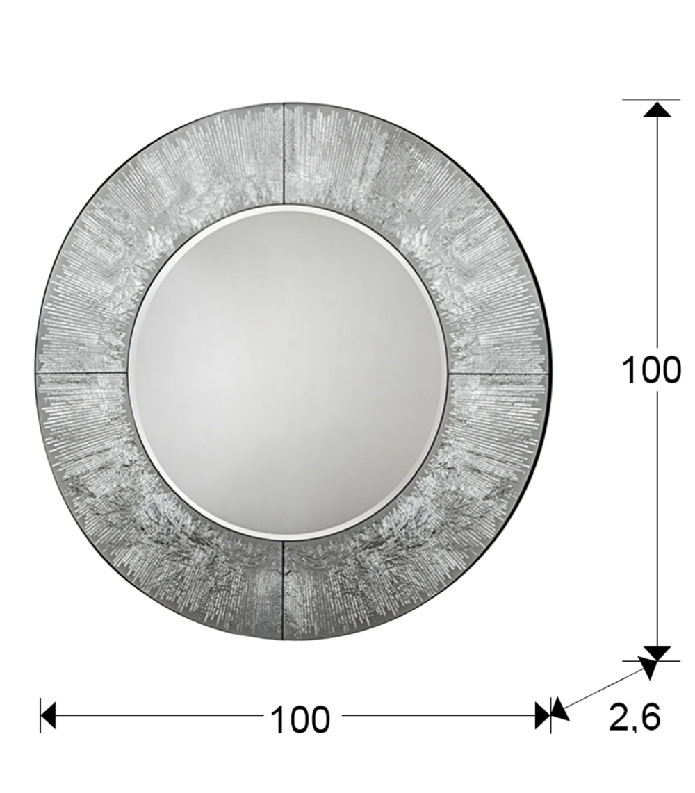 Зеркало круглое с фаской, рама из стекла с графическим узором из серебряной фольги. Установлено на основе из MDF, покрытой чёрным лаком.