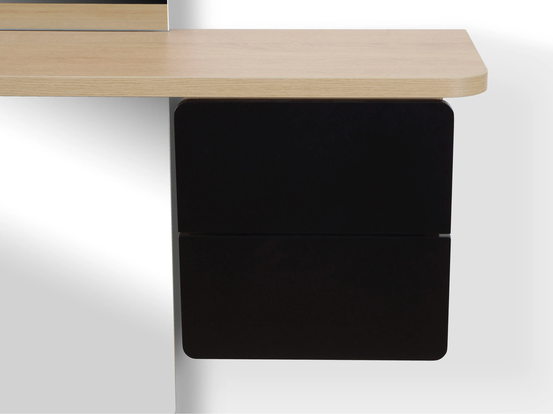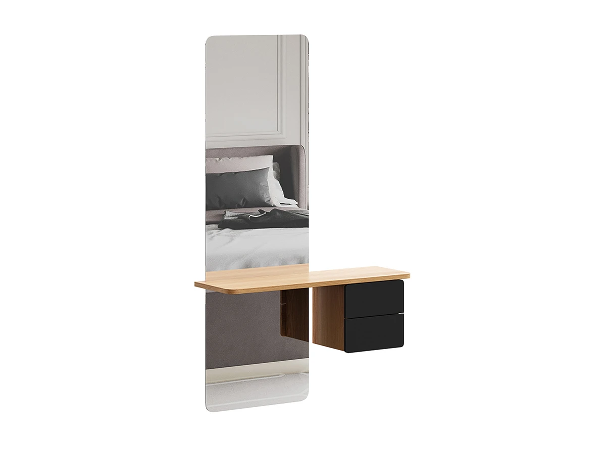 Изделие состоит из столешницы с подвесной тумбой и двух навесных зеркал – верхнего и нижнего. Углы зеркала, столешницы и фасада скруглены. Подзеркальный щит заглублен по отношению к зеркалу на 40мм. Вся конструкция крепится на стену. От тщательности выполнения разметки зависит качество сборки изделия.