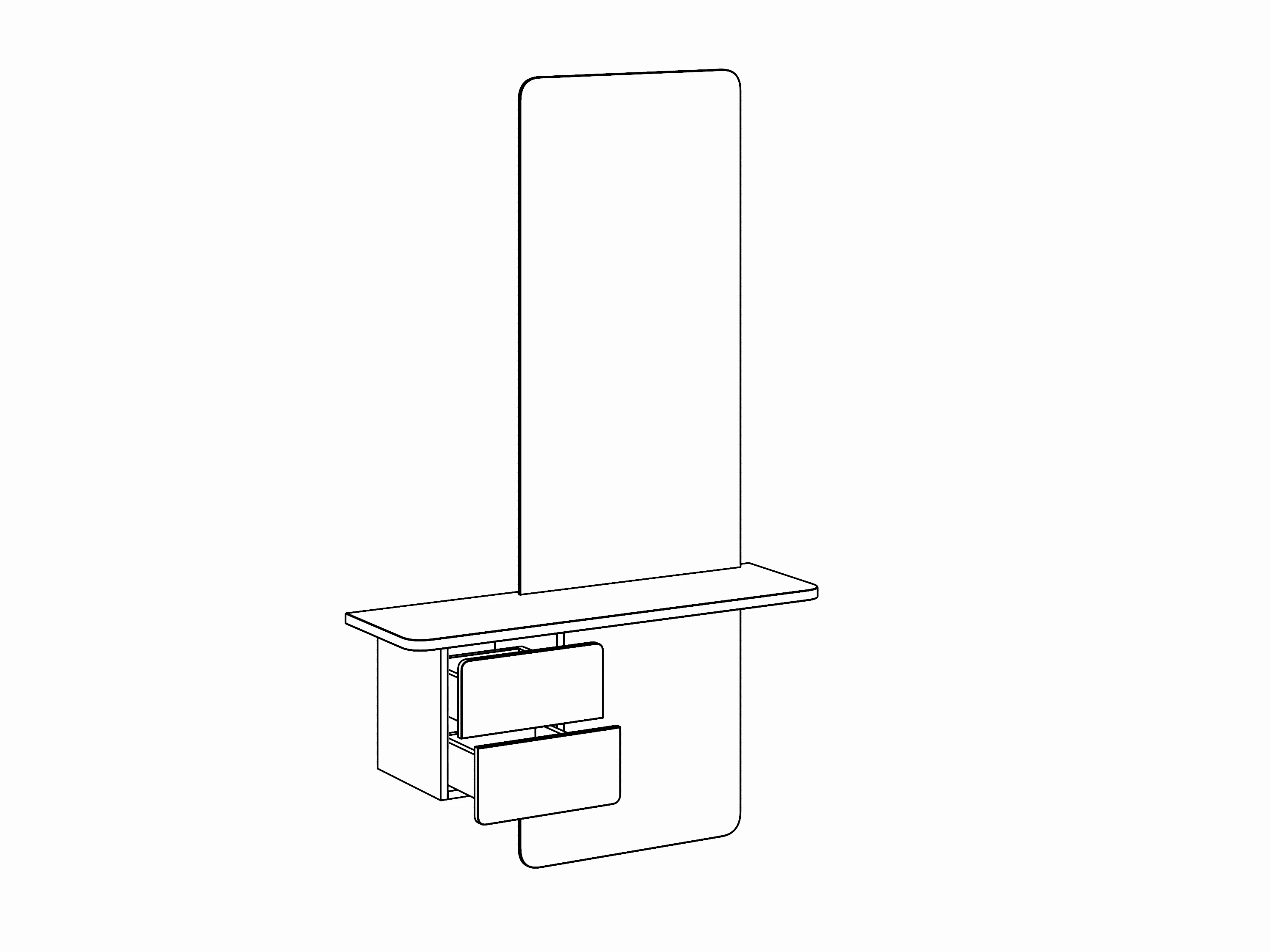 Изделие состоит из столешницы с подвесной тумбой и двух навесных зеркал – верхнего и нижнего. Углы зеркала, столешницы и фасада скруглены. Подзеркальный щит заглублен по отношению к зеркалу на 40мм. Вся конструкция крепится на стену. От тщательности выполнения разметки зависит качество сборки изделия.