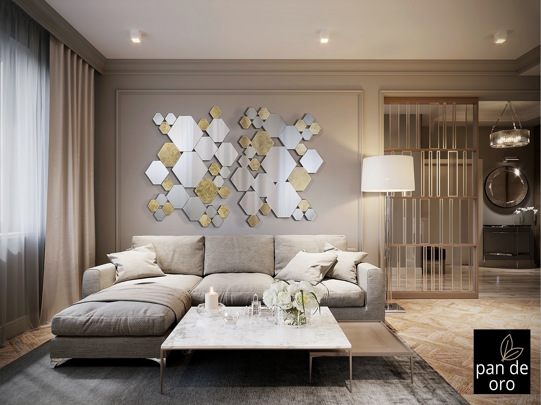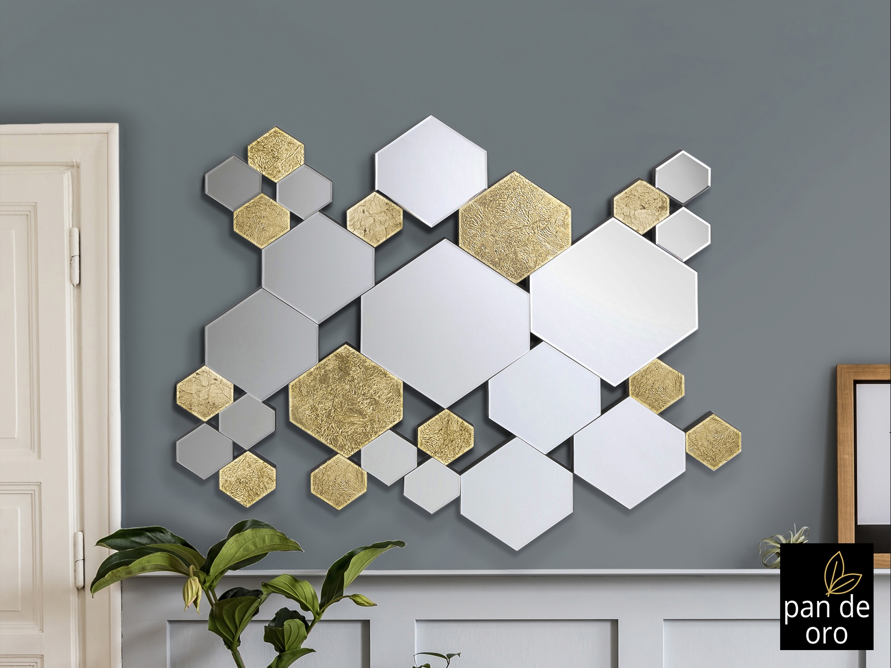 Зеркало образовано шестиугольниками лун и кристаллов с дном из ЗОЛОТОЙ ПАНЕЛИ, скошенное. Задняя часть из лакированного МДФ черного цвета. Готовы повесить в горизонтальном или вертикальном положении.