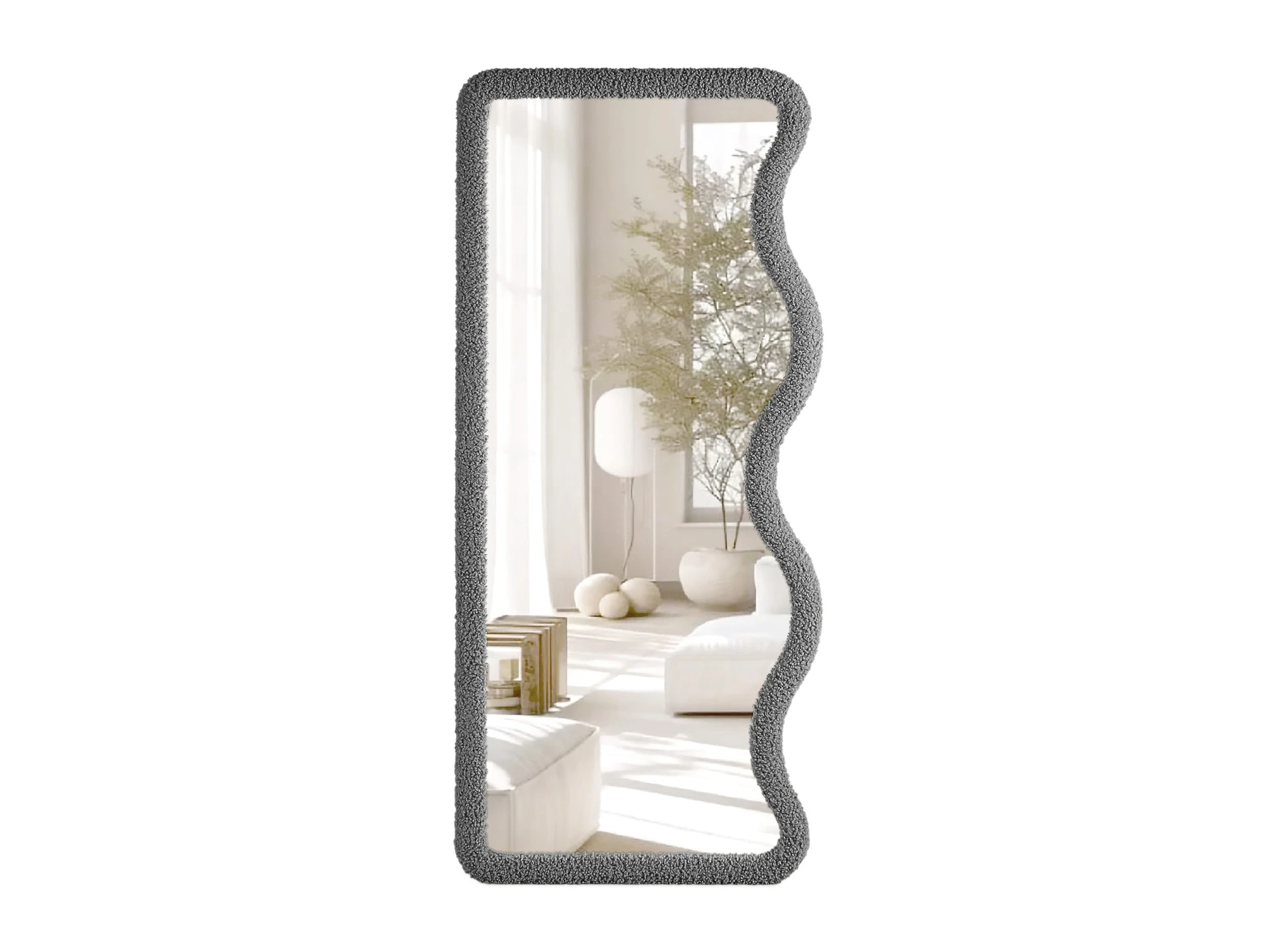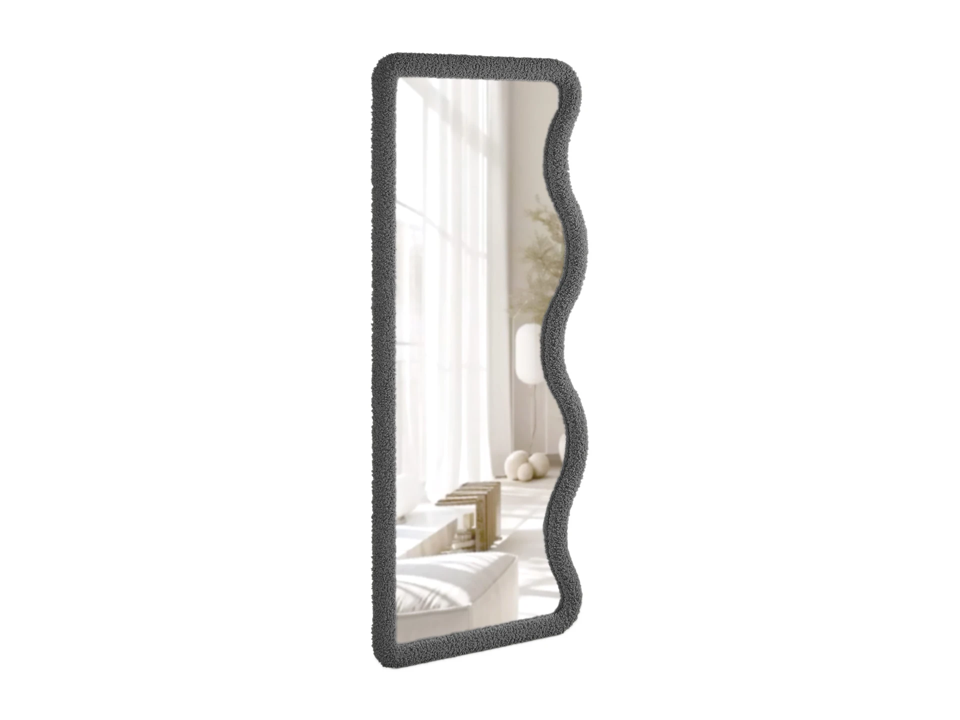 Напольное фигурное зеркало Francis выделяется оригинальной геометрией. Волнистый край контрастирует с прямыми линиями, поддерживает тренд на плавные формы и активную геометрию в интерьере. Рама выполнена из МДФ, обтянута фактурной тканью «букле». Что добавит в ваш интерьер тактильности, глубины, многослойности. Размер зеркального полотна 75x175 см — можно увидеть себя в полный рост.