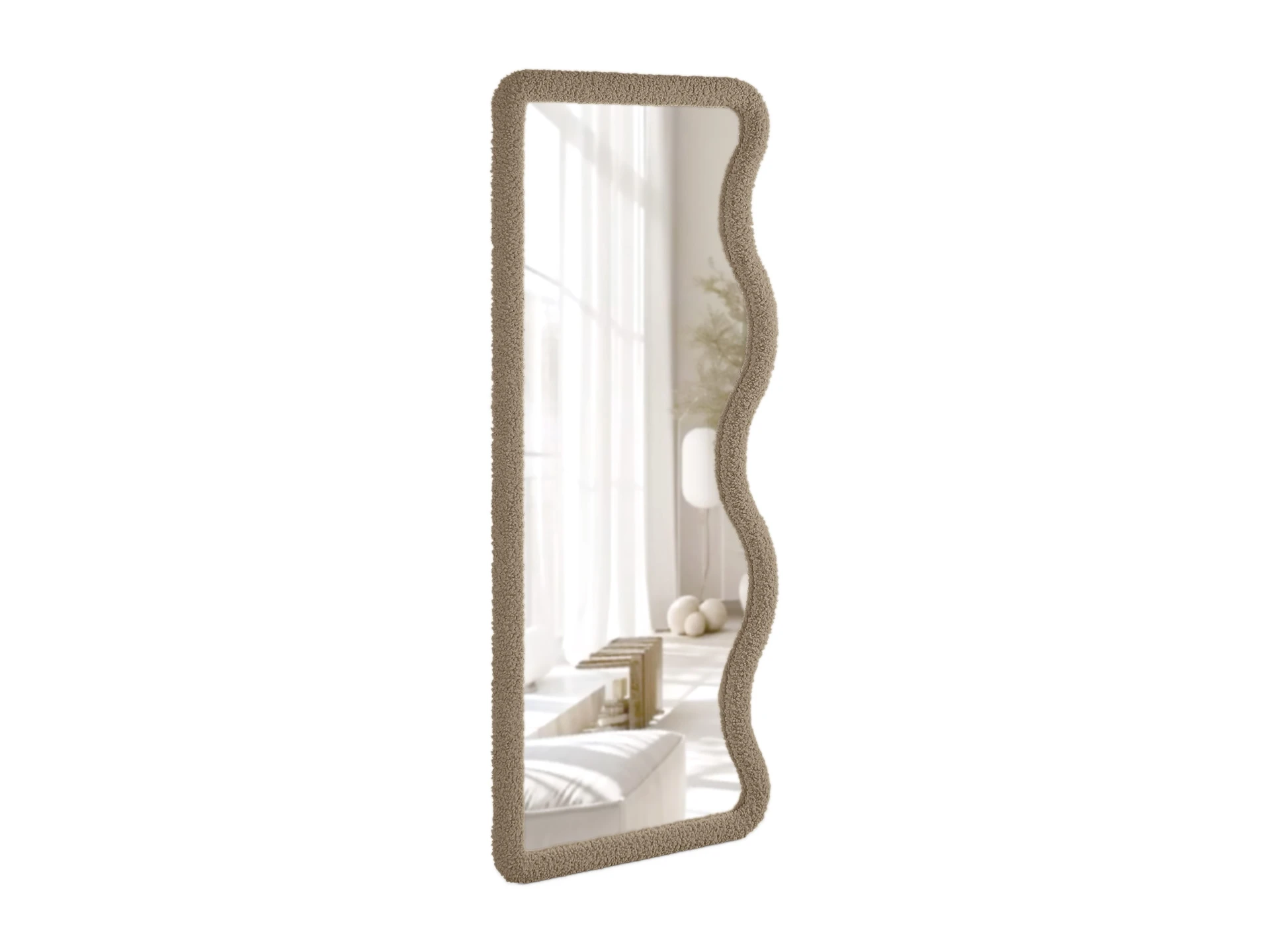 Напольное фигурное зеркало Francis выделяется оригинальной геометрией. Волнистый край контрастирует с прямыми линиями, поддерживает тренд на плавные формы и активную геометрию в интерьере. Рама выполнена из МДФ, обтянута фактурной тканью «букле». Что добавит в ваш интерьер тактильности, глубины, многослойности. Размер зеркального полотна 75x175 см — можно увидеть себя в полный рост.