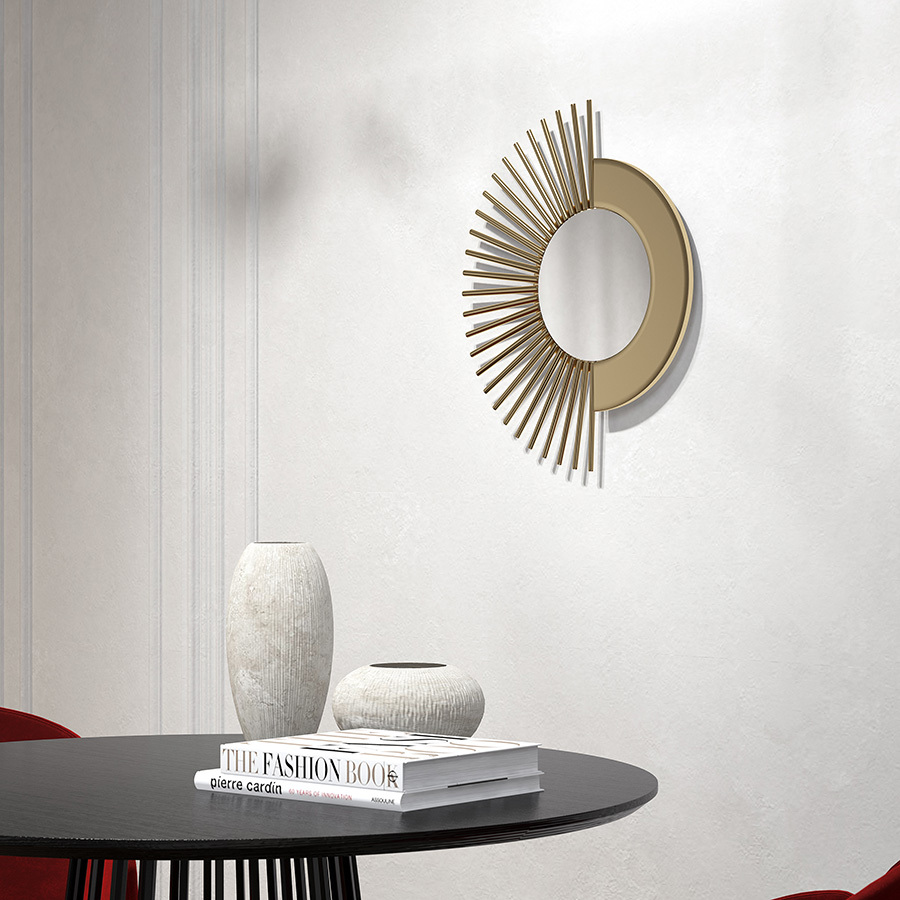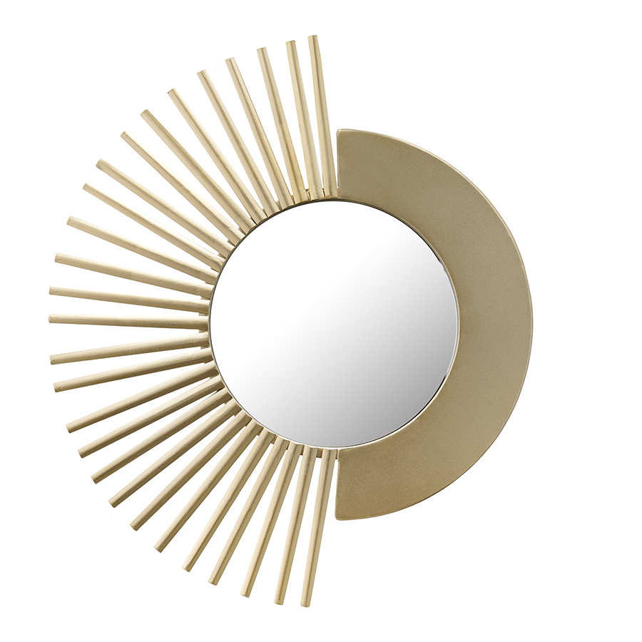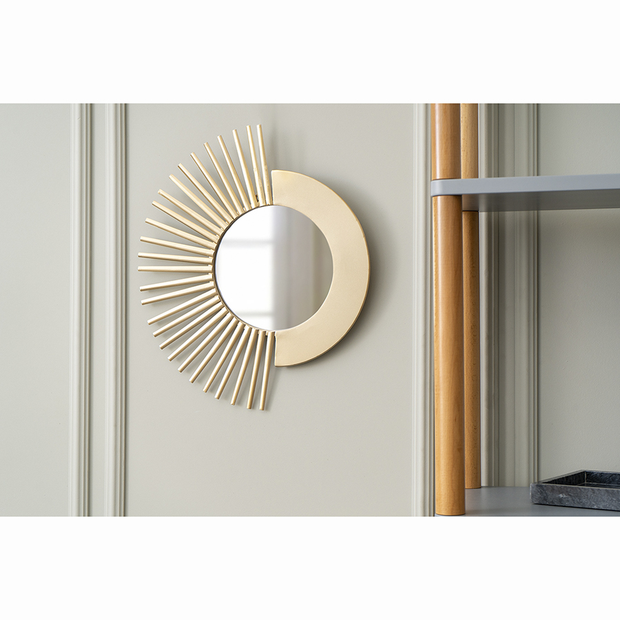 Аксессуар имеет прочную и надежную раму из железа. Золотистый оттенок латуни и элементы, напоминающие солнечные лучи, создают волшебный визуальный образ, наполняющий пространство уютом и теплом. За счет универсального цветового решения зеркало великолепно смотрится как на светлой, так и на темной стене.