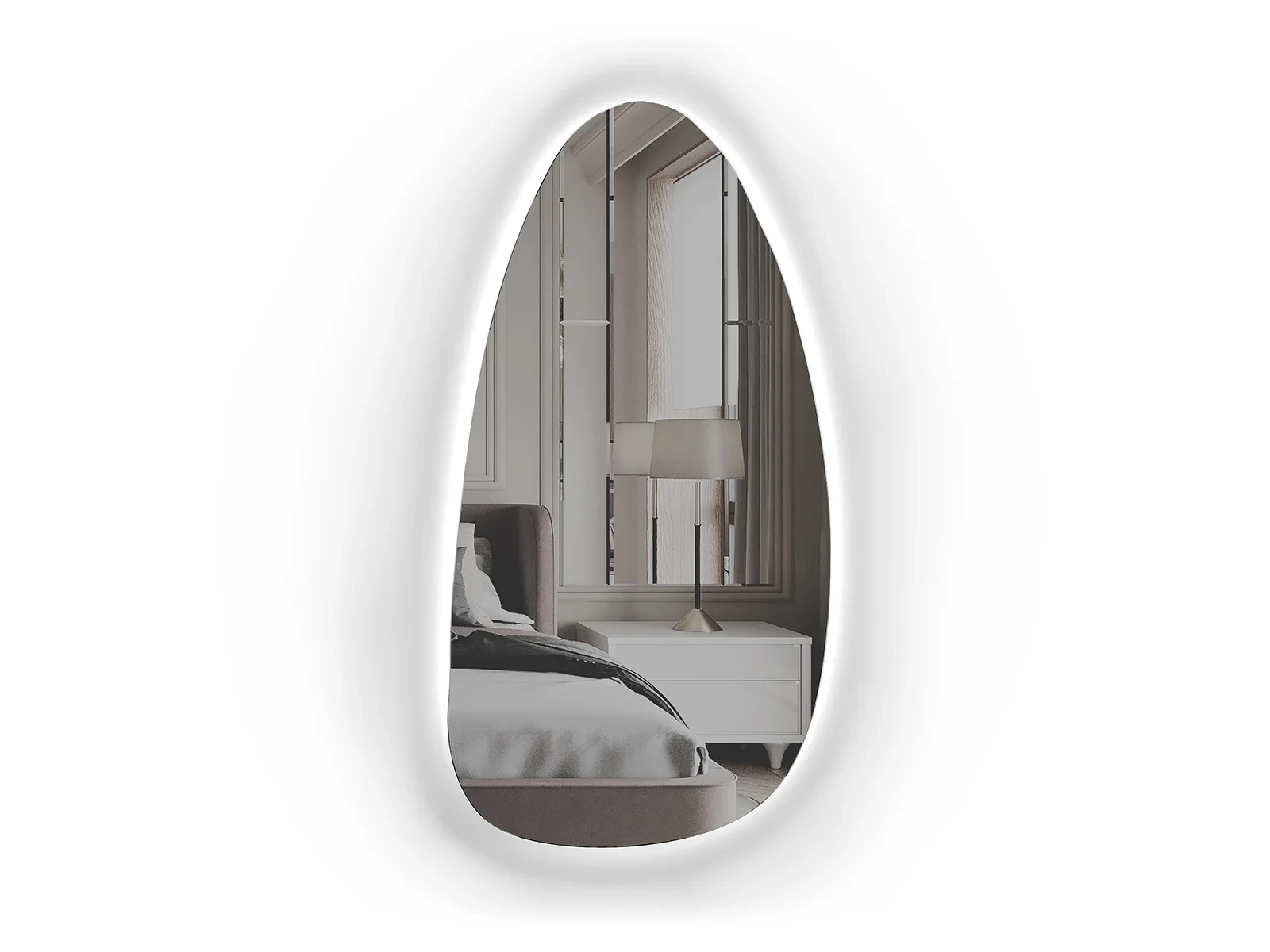 Зеркало настенное Stone большое с подсветкой представляет собой зеркальную деталь фигурной формы, установленную на подзеркальный щит. Подзеркальный щит утоплен по отношению к зеркалу на 40мм. На кромку подзеркального щита наклеена светодиодная лента LS-3528CW60-4.8-IP65-12V. Категория цветности света - Холодная дневного света (>5300 К). Драйвер для светильника установлен в подзеркальном щите, укомплектован сетевым шнуром с ножным выключателем, длина шнура 1,9м. Зеркало имеет крепления для установки на стену только вертикально.