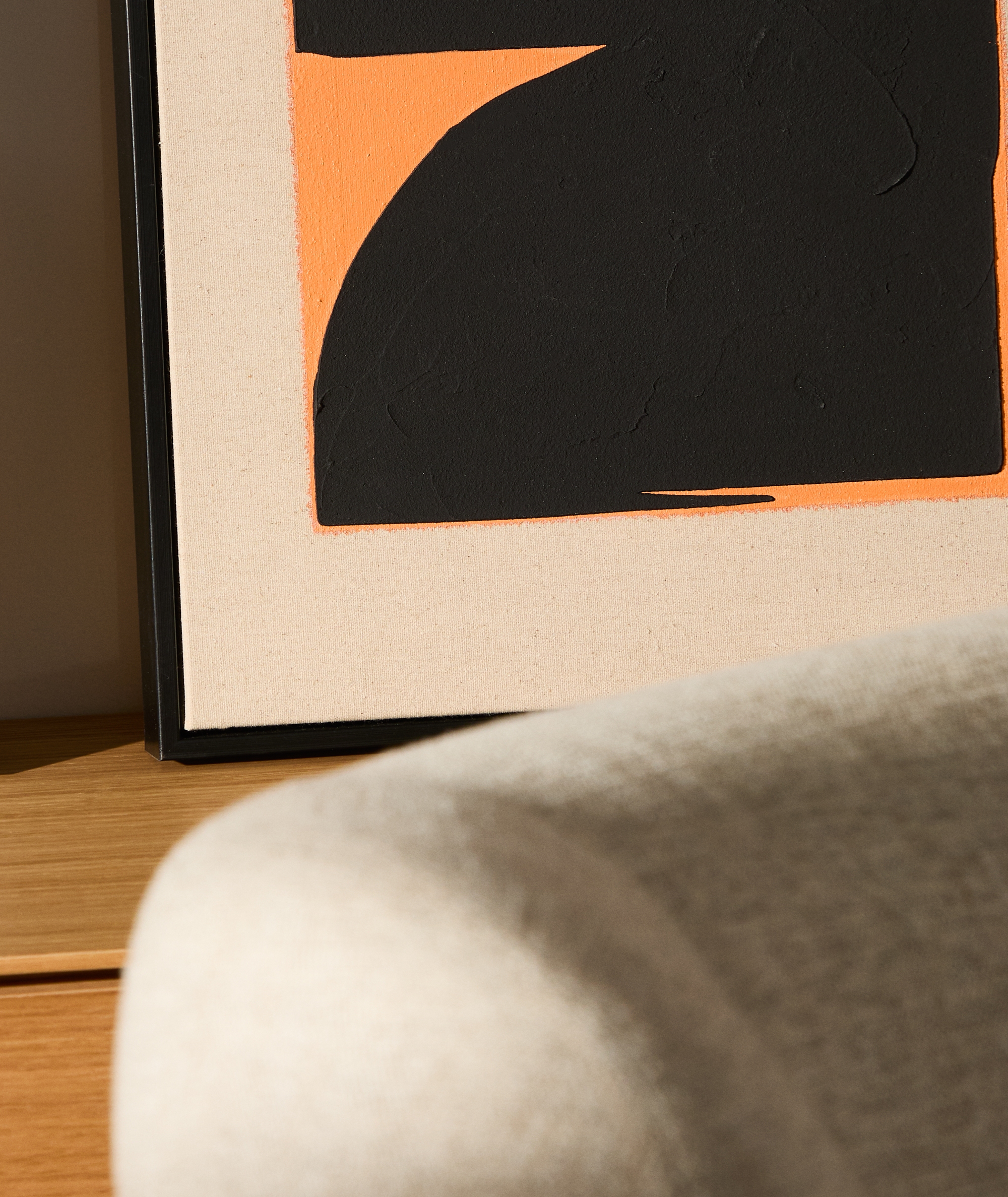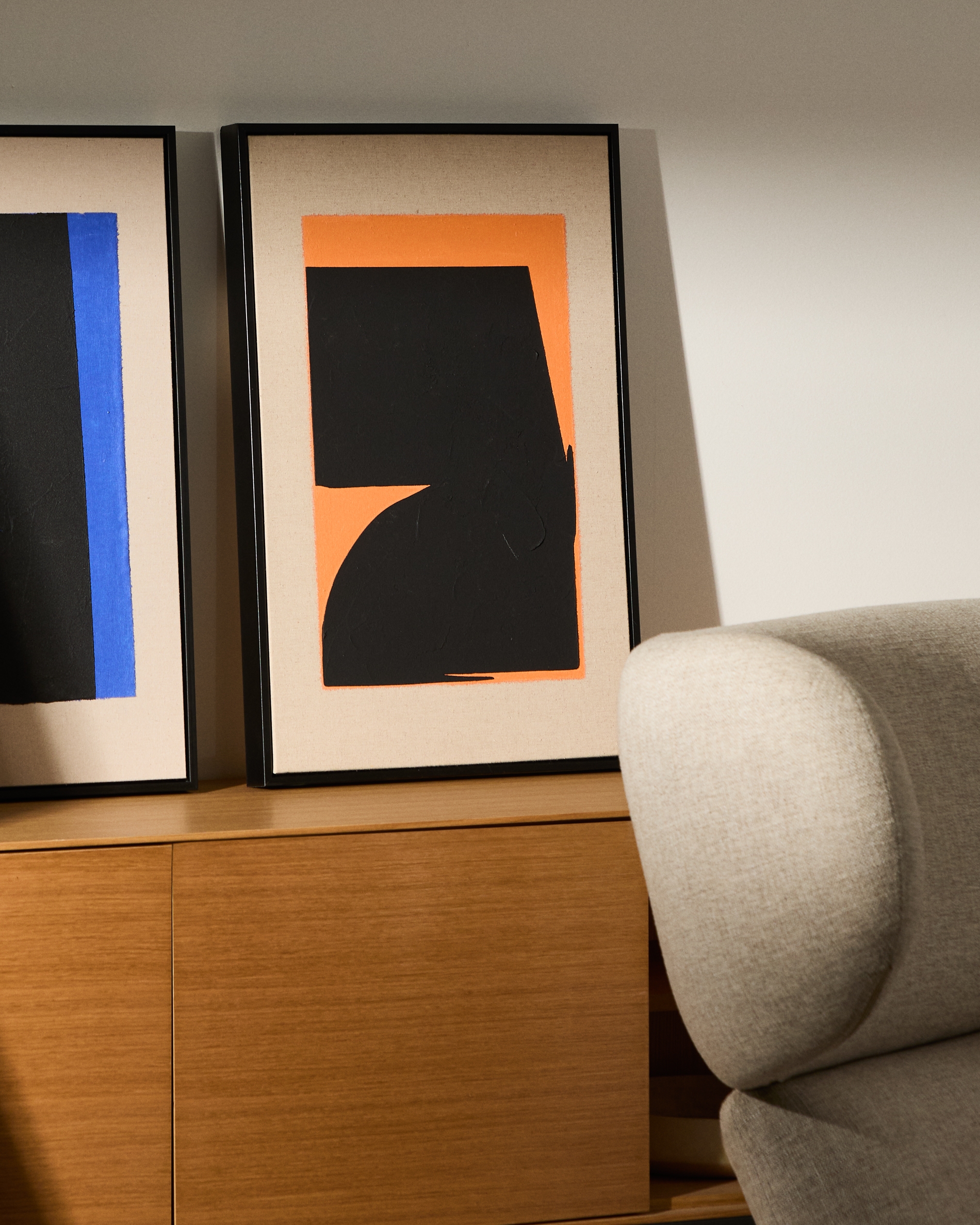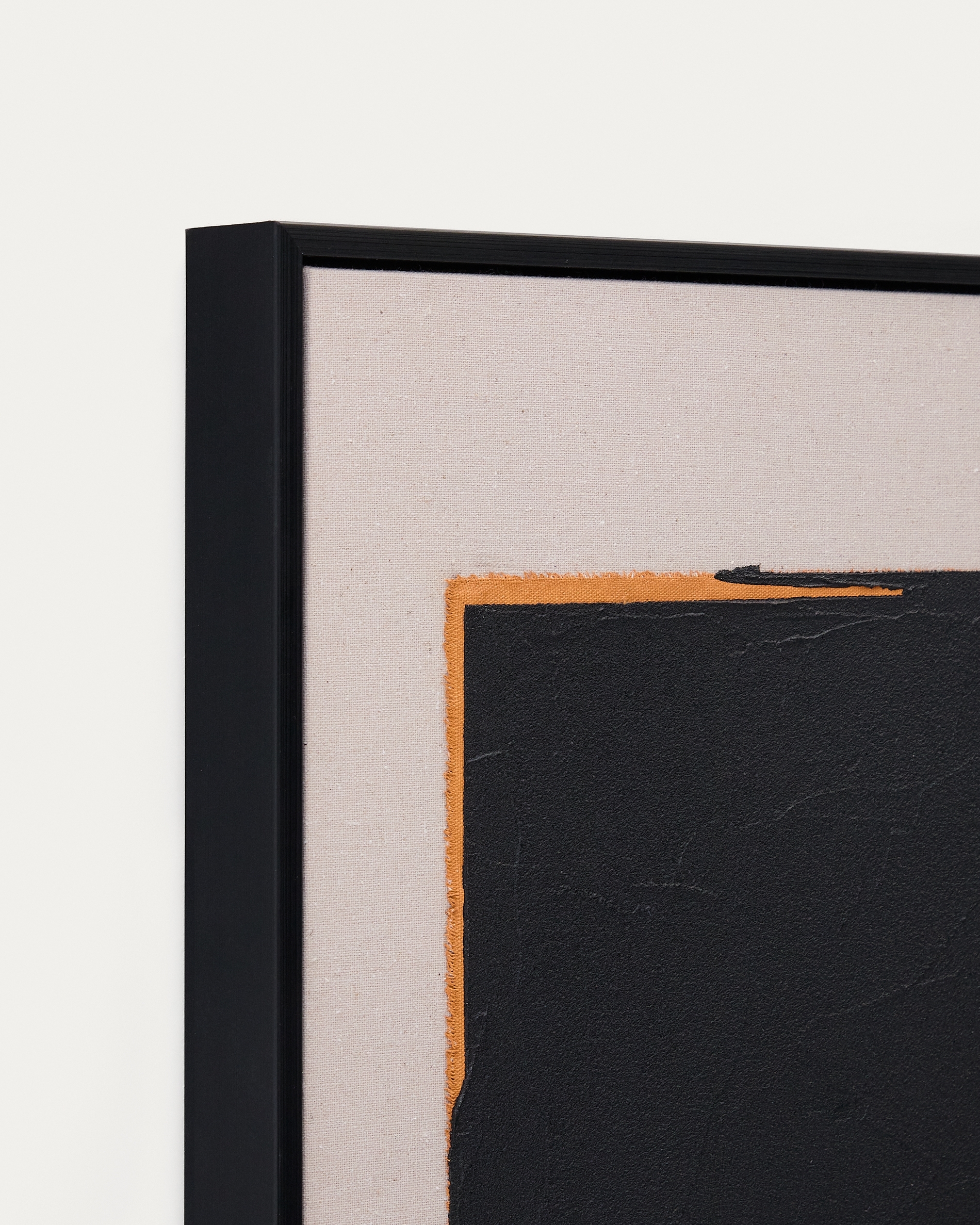 Коллекция Zernu играет на контрасте между чёрным и цветным, создавая положительный и отрицательный эффект, который придаёт визуальную выразительность каждому изделию. Этот дизайн создаёт ощущение предметов на фоне света, подчёркивая формы и объёмы с захватывающим эффектом. Чёрная часть выполнена краской, а цветной фон — из окрашенной ткани, что создаёт наложение, придающее глубину и объём. Холст сочетает в себе разные текстуры, делая заметным контраст между краской и тканью. Каждый штрих воспринимается уникальным образом, подчеркивая богатство материалов и использованной техники. Картина заключена в черную рамку, которая определяет и завершает композицию чистой и точной отделкой.