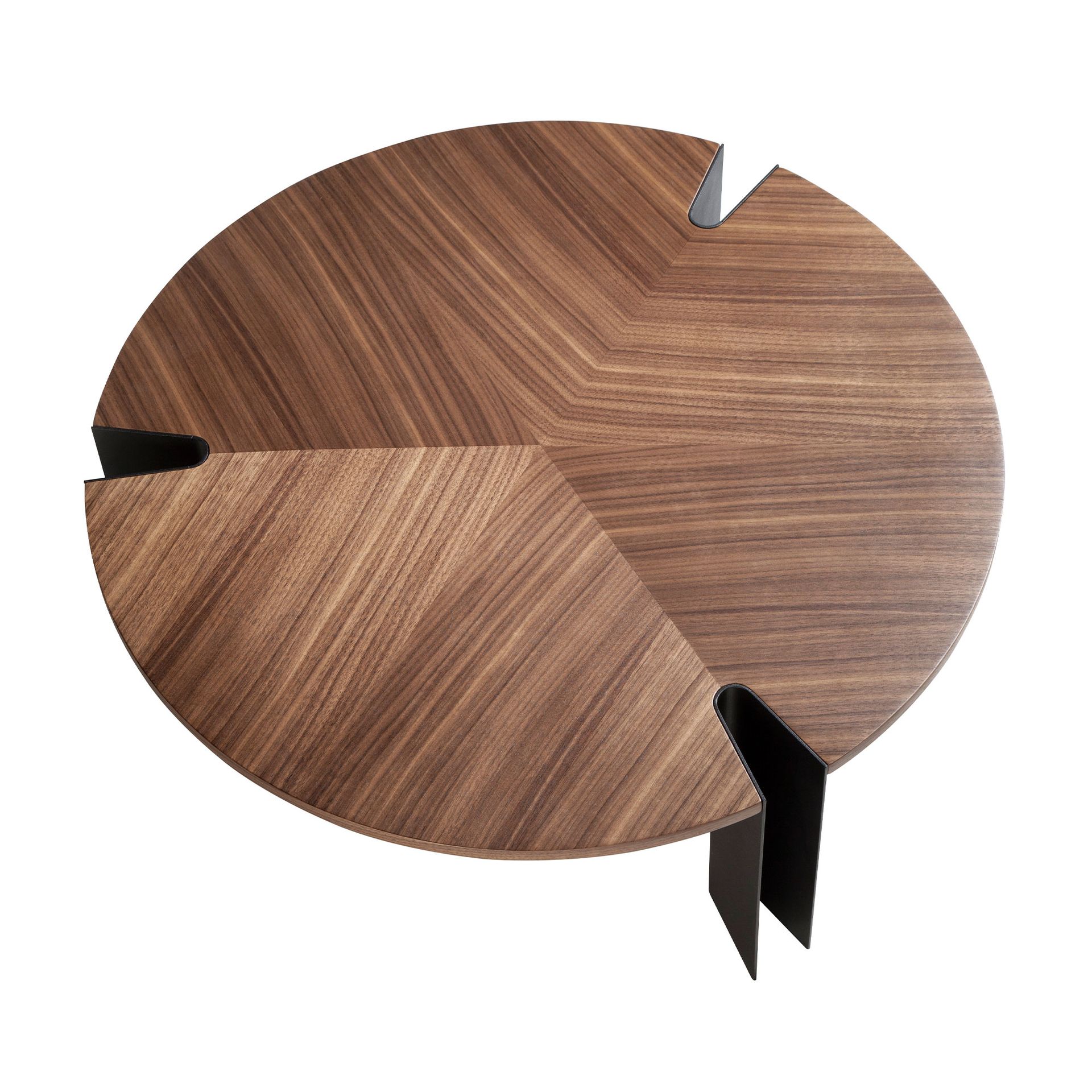 Круглый журнальный столик со столешницей из шпона орехового дерева. Структура ножек из нержавеющей стали, окрашенной черной эпоксидной смолой.