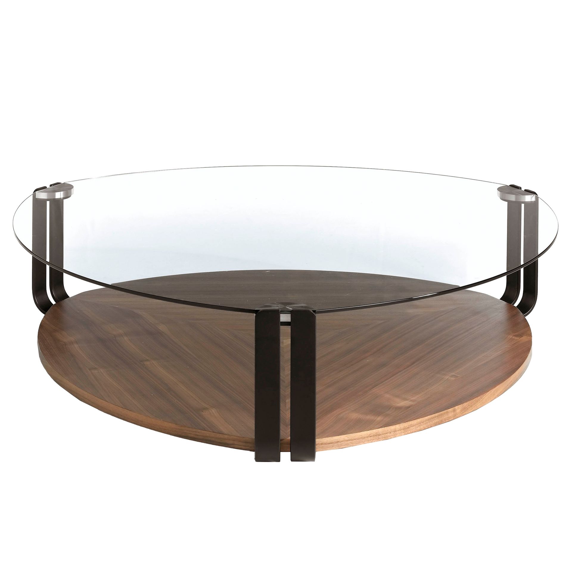 Стекло соединено тремя парными металлическими ножками с деревянным основанием. Оно сделано из МДФ и шпона орехового дерева (цвет базового фабричного варианта), имеет ту же форму и размер, что и столешница. Древесный рисунок выполнен в виде треугольников. Этот нижний ярус служит не только опорой для стола, но также может использоваться в качестве полки, второй столешницы.