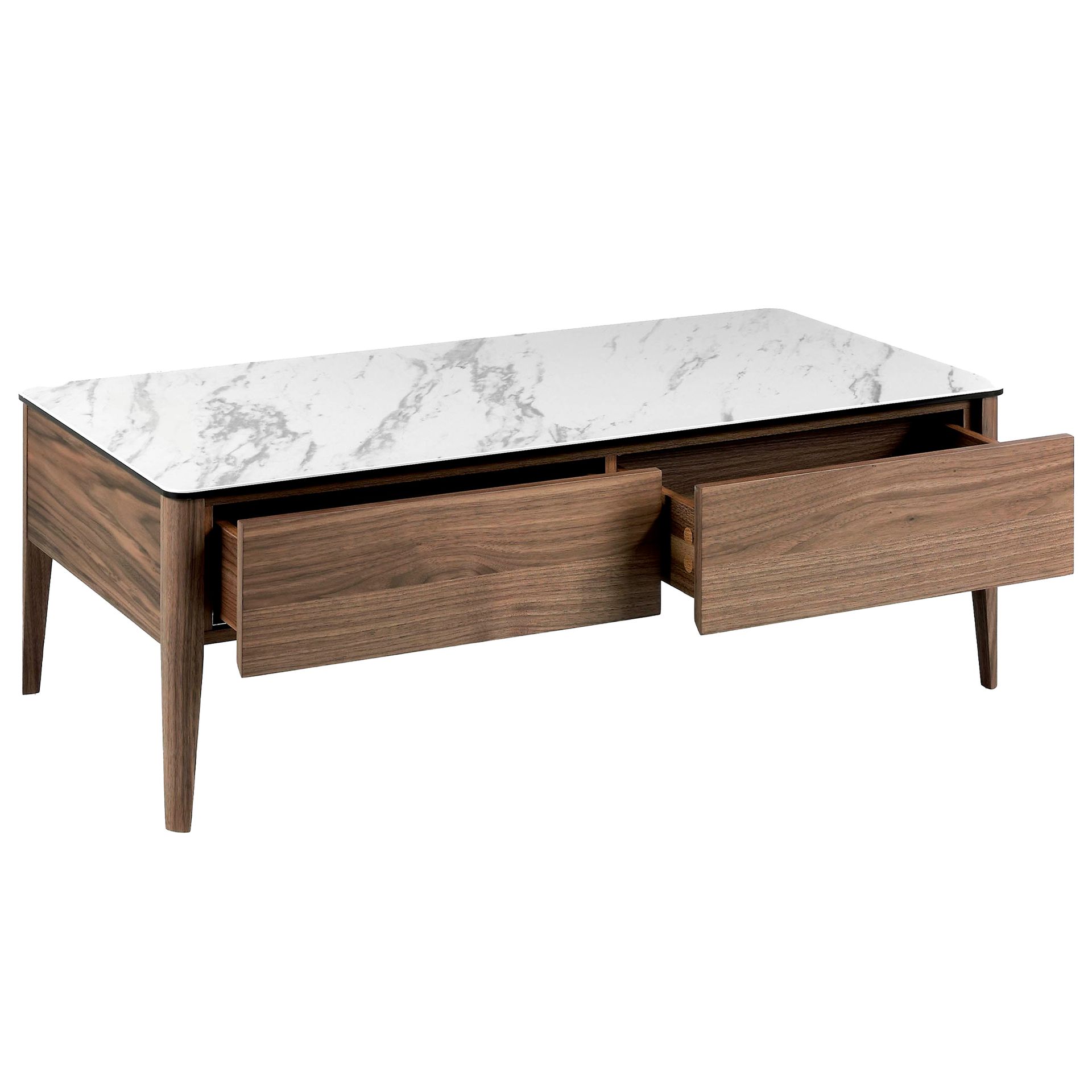 Журнальный столик в современном стиле с белой керамической столешницей 4 мм и деревянной основой из МДФ и натурального орехового шпона толщиной 0,5 мм с двумя ящиками с системой открывания нажатием и плавным закрытием. Простота и элегантность этого журнального столика идеально подходят для того, чтобы привнести этот элегантный и изысканный штрих в вашу гостиную. Каждая деталь призвана предложить вам максимальный комфорт и функциональность, не забывая при этом о стиле.