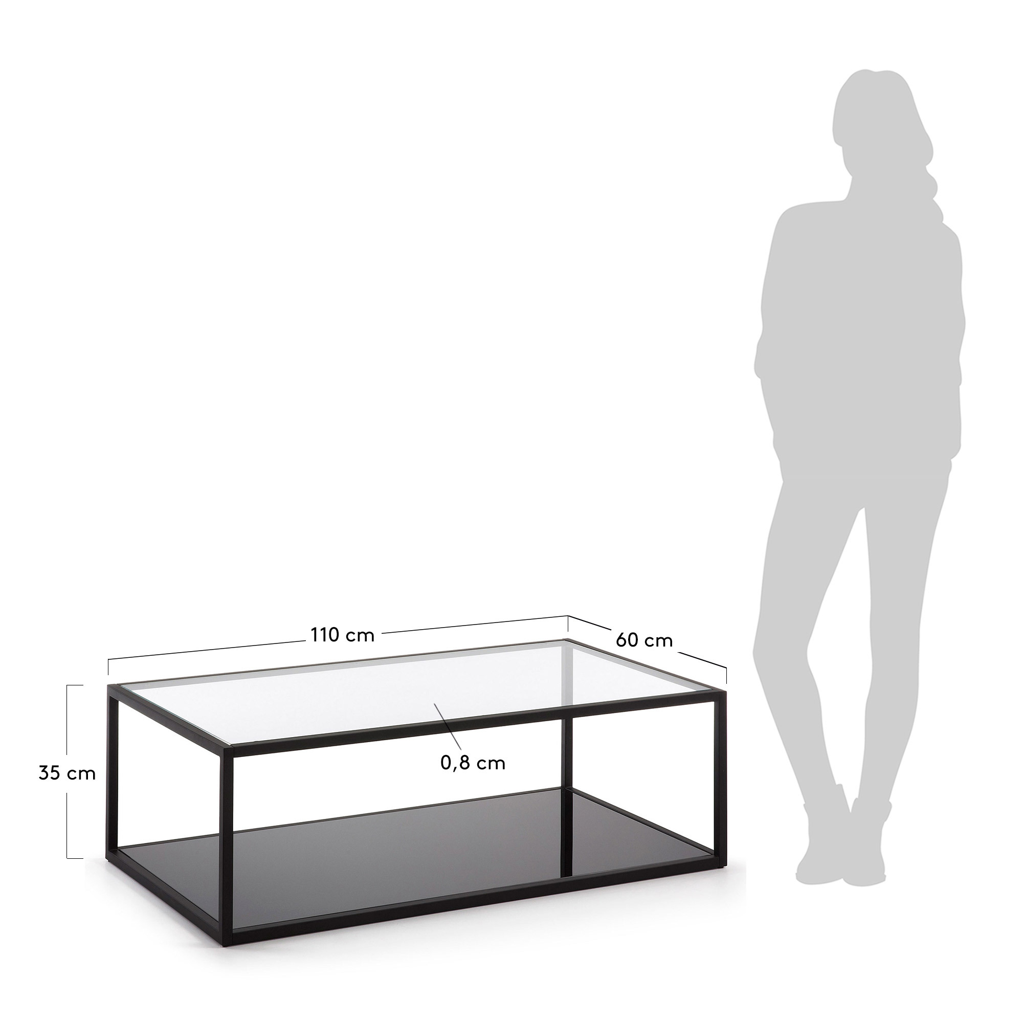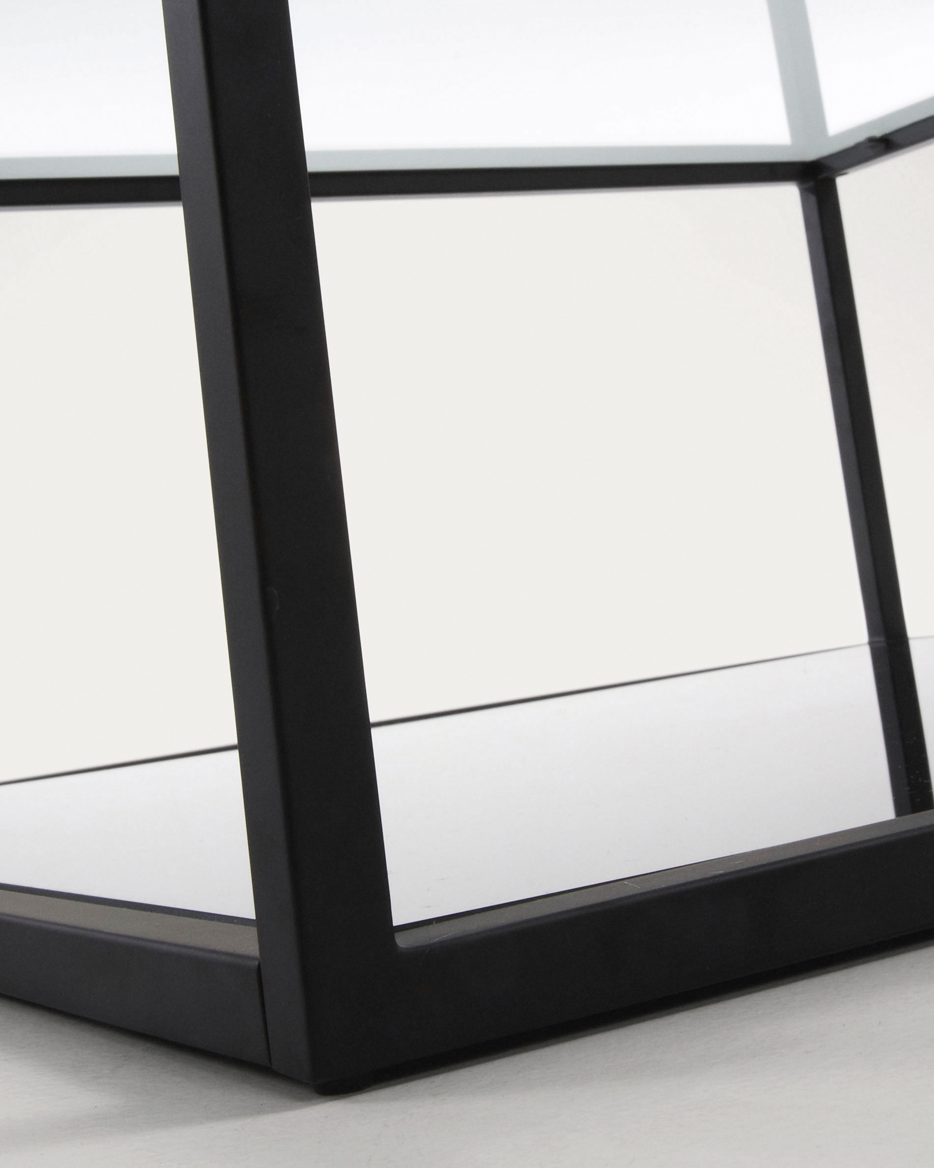 Конструкция двухярусная — стол имеет две стеклянные столешницы. Толщина столешниц — 0,8 см. Верхний ярус прозрачный, нижний черный глянцевый.