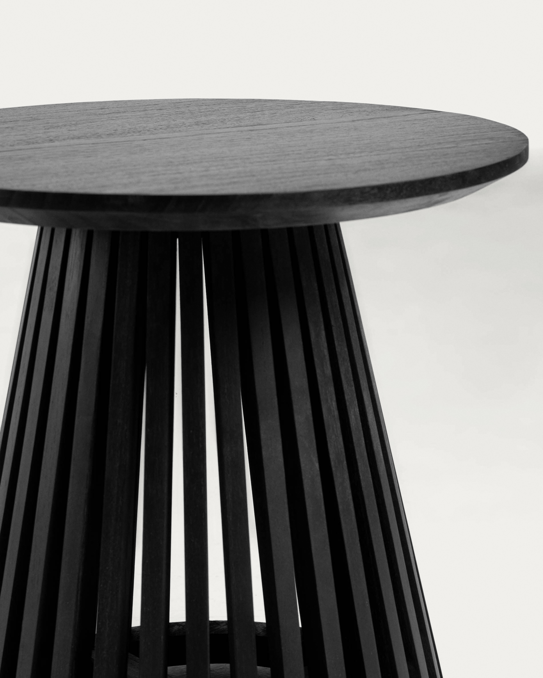 Столик состоит из круглой столешницы диаметром 50 см и конусной опоры с реечной структурой. Материал изготовления - тиковое дерево в натуральной отделке. Древесина отличается высокой прочностью и долговечностью, она выдерживает интенсивную эксплуатацию при соблюдении рекомендаций по уходу.