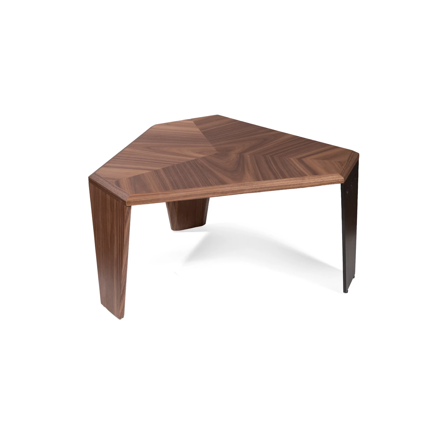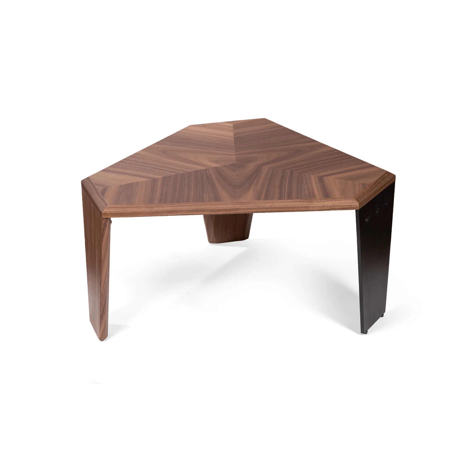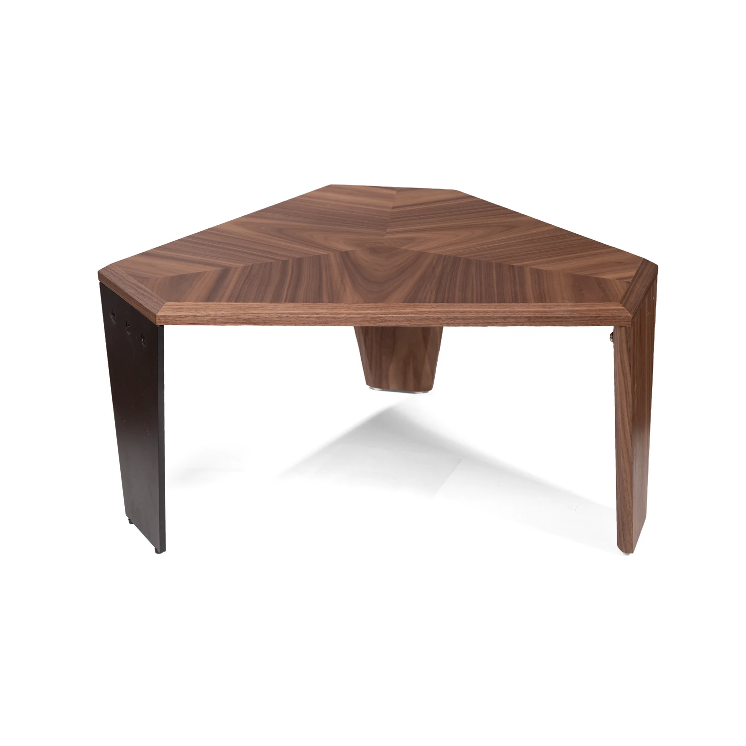 Столешница из МДФ, покрыта натуральным шпоном ореха. Благородный рисунок древесины подчеркивает геометрию стола, создавая игру природных линий. Оттенок — тёплый орех с характерными переливами от медово-коричневого до глубокого шоколадного*.