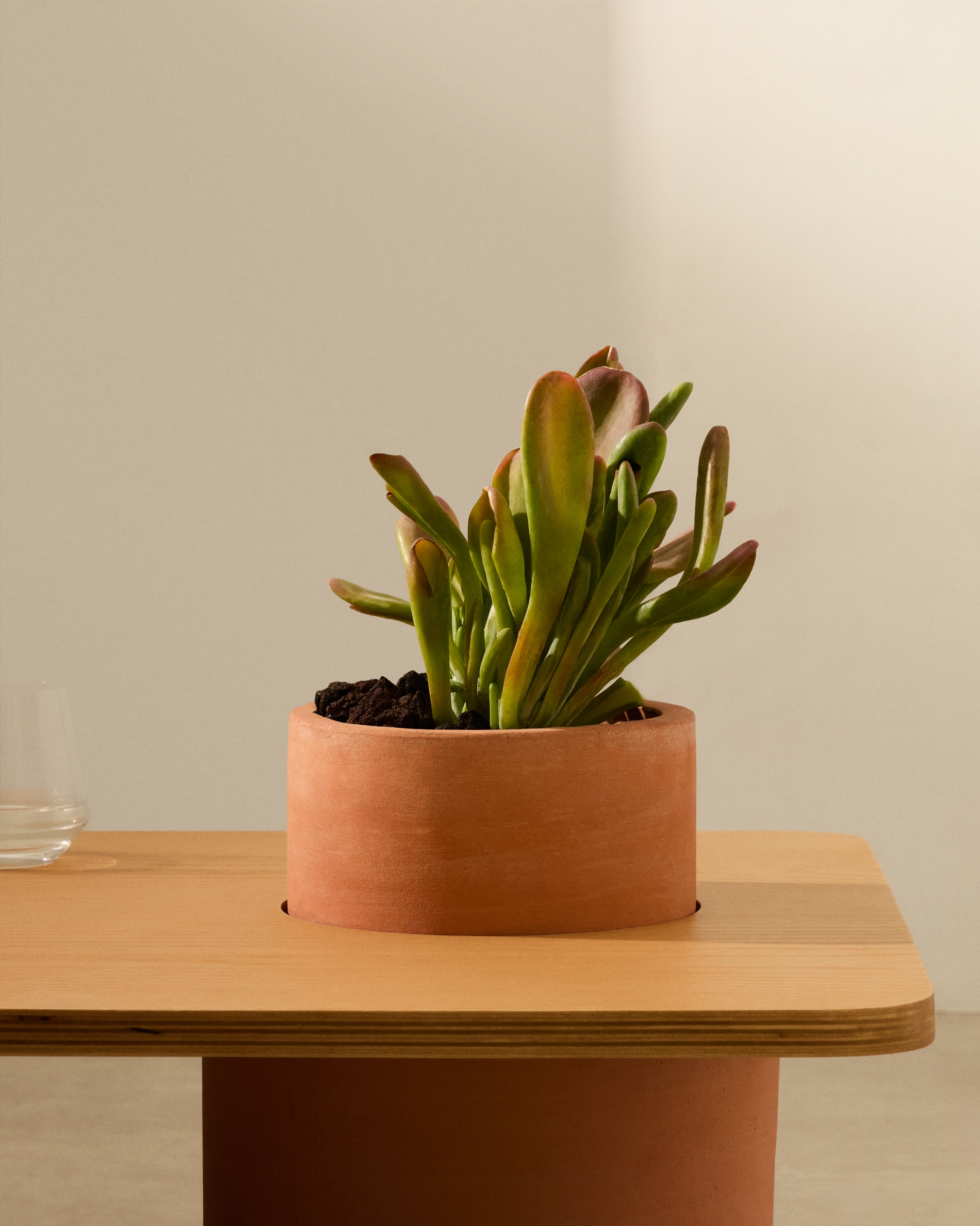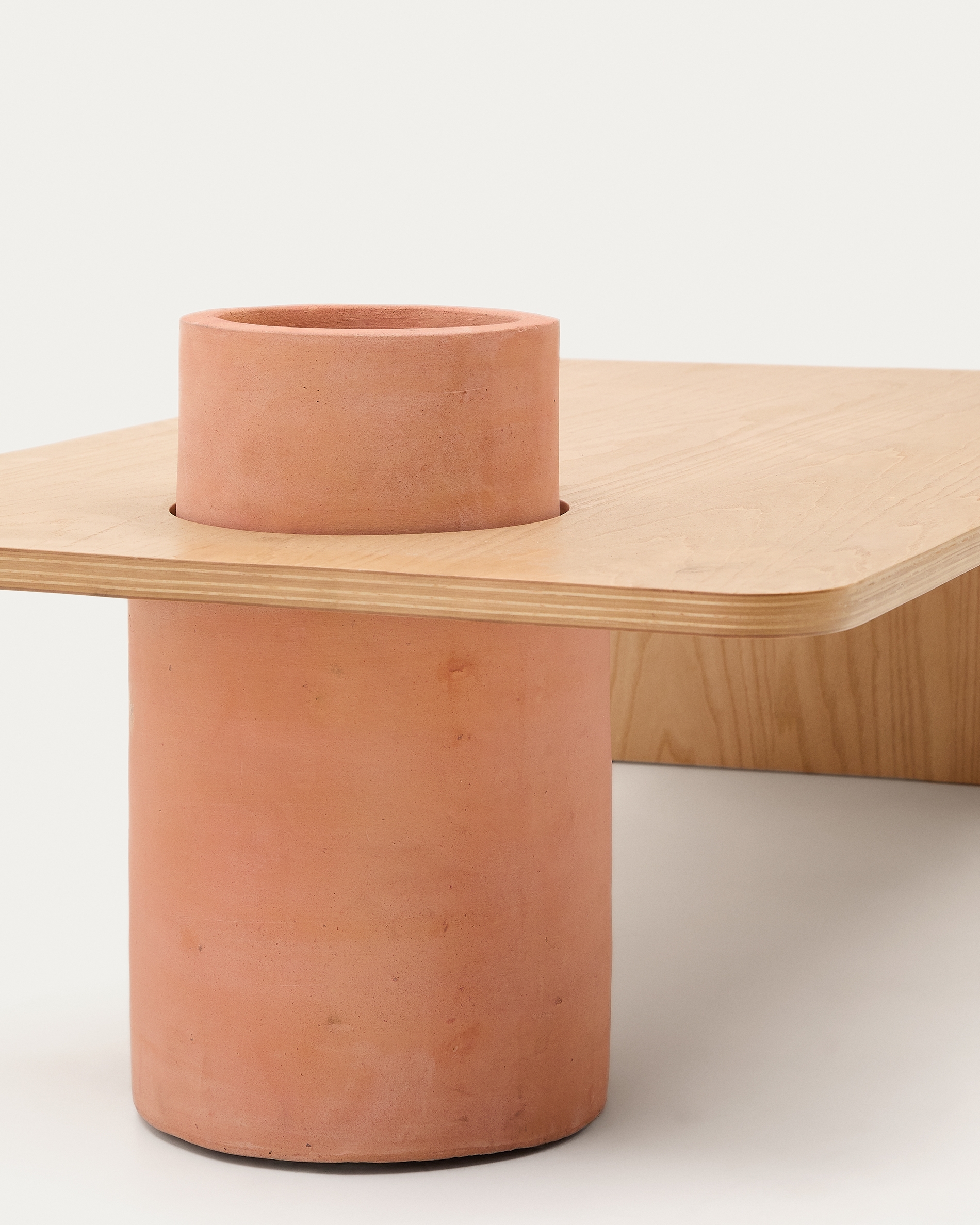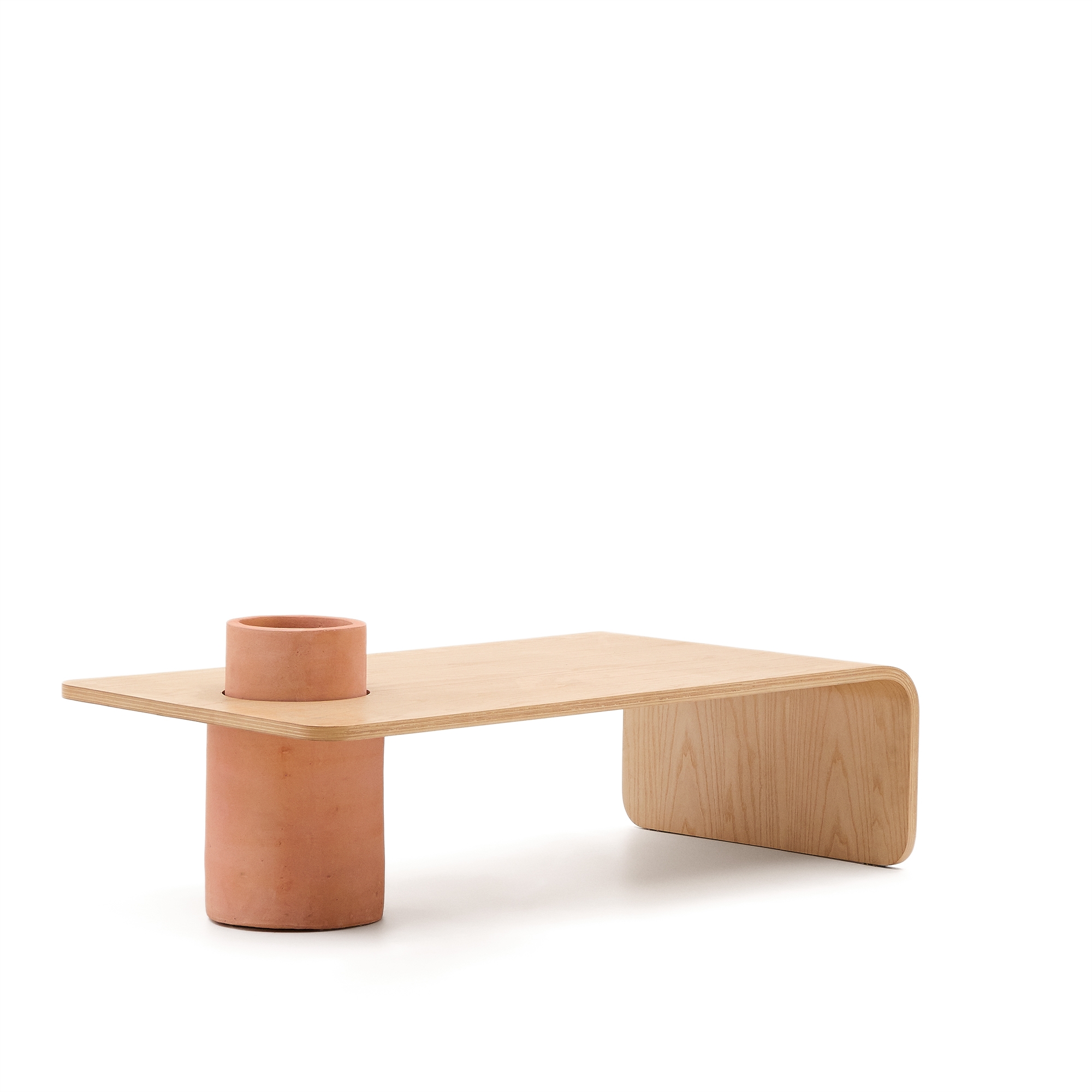 Olaria смешивает дубовый шпон с терракотой, чтобы создать журнальный столик с изогнутыми краями, который идеально подходит для всех типов помещений. Кроме того, благодаря большому пространству внутри ножку стола можно использовать как горшок для растений. Дизайн и универсальность объединены в одном уникальном изделии.