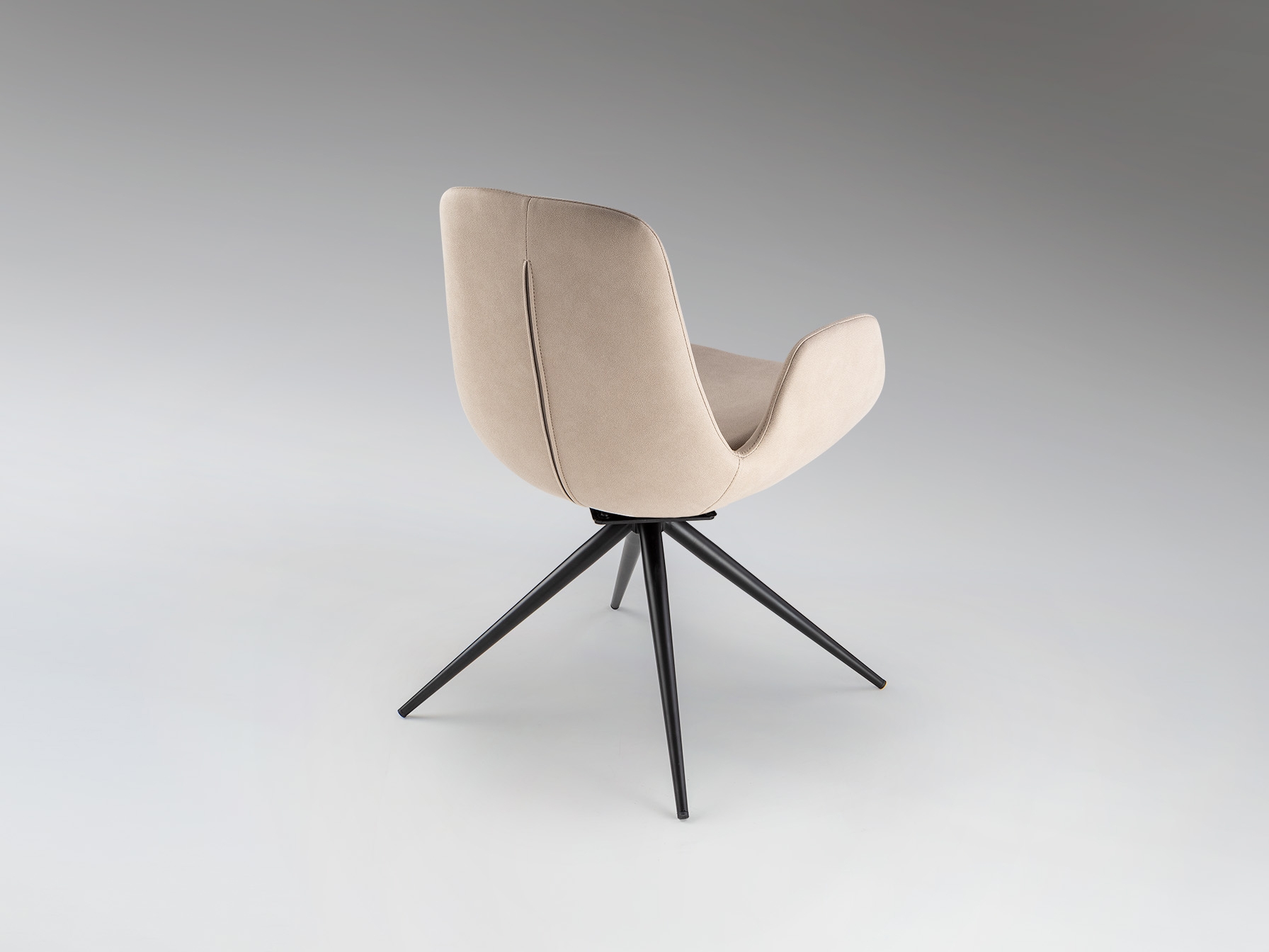 Вращающееся кресло, металл, матово-черная отделка. Сиденье и спинка из фанеры и пены. Поворотный механизм с автоматическим возвратом. Обивка из 100% полиэстера бежевого цвета. Химчистка